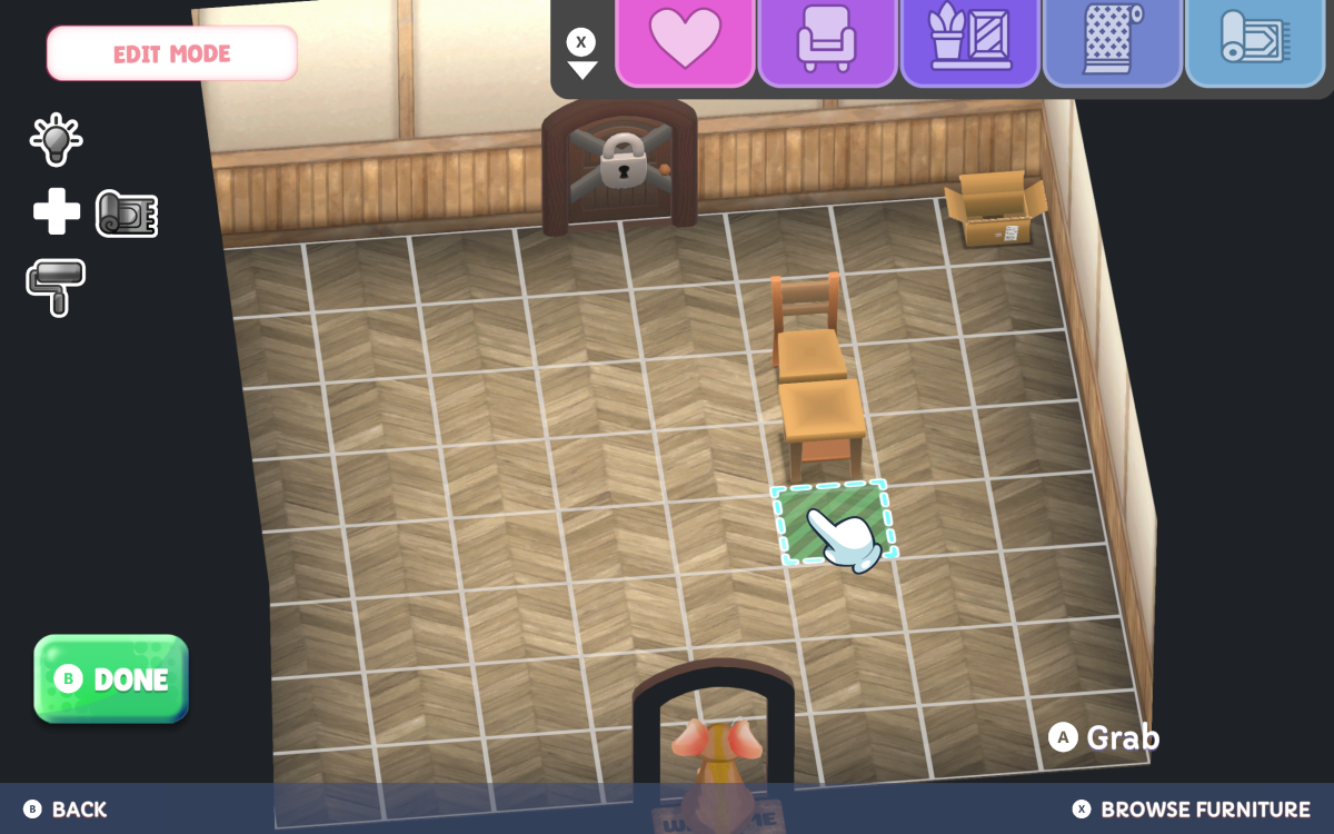 Squeakross begins with the player creating a mouse avatar. This is the little friend whose home you’ll be decorating, and the character will appear as something of a mascot as you play. The character creator is more robust than I expected, with different ear, eye, mouse, nose, tail, and fur options all available. Since you do see the lil’ critter around quite a bit, I found it a novel touch.