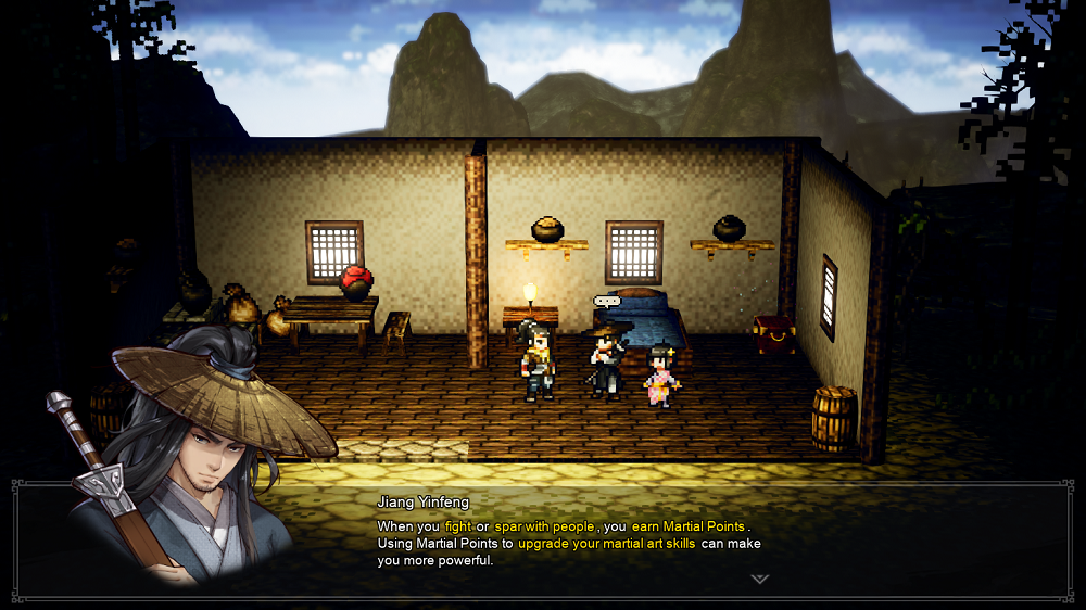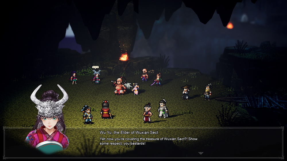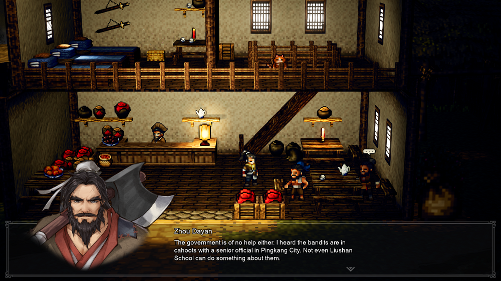 Wandering Sword is trying to emulate that sort of feel. It definitely succeeds in that aspect! Everything from the plot and story beats to the character designs are reminiscent of the genre, and it plays all of the tropes with an earnest and infectious enthusiasm. Wuxia flicks and shows were never my thing, but playing this makes me want to explore what the genre has to offer. Its unique world comes to life in such a vibrant way thanks to the HD-2D graphics. Even idling about the various locales is a visual treat. However, the story definitely assumes that the player is familiar with common fictional sects. Characters pop into screen accusing so-and-so of being part of this Sect or that group that it was a headache trying to keep track everyone and their relationships.