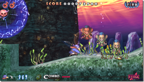 You can also come move right into a dash/sprint while coming out of your spin by releasing Circle while holding a direction. This is useful because it lets you jump farther than usual, which you’ll need to be able to do in later stages. Holding down on the D-pad while dashing will make you slide on your belly. Holding down on the D-pad during a jump will make you do a hip pound (butt stomp) that stuns enemies. The triangle button lets you lift and throw objects, and as mentioned before, L+R+X while cause you to self-destruct. You might wonder why the move exists at all, but trust me, you’ll find yourself using it sooner or later.