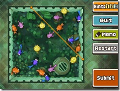 Of course there is, but you have to solve a few dozen puzzles before you can get there. Just like other games in the series, everyone wants Layton’s help to figure out the next playing card in a sequence or how to arrange apples in different baskets. Puzzles range from mini math tests to word twisters to mazes to rearranging blocks. Level-5 designed the DS game with a good amount of puzzle diversity. Although, the types of puzzles in The Last Specter should be familiar to people who played the other games. The puzzles have an outside of the box trick to them that Professor Layton fans will probably pick up on quickly. If you get stuck you can spend hint coins earned by tapping the background for clues. Players still have to tap everywhere, but a helpful fish reveals some of the hidden hint coins.