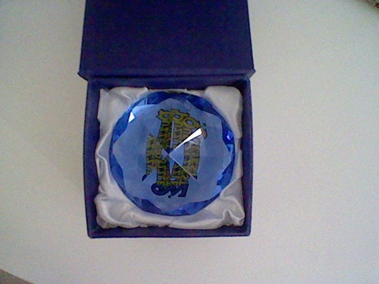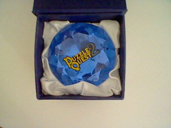 D3 Publisher mailed a desktop trinket as a reminder that Puzzle Quest 2 is coming out soon. This plastic gem went out to journalists and it’s a paperweight, a super sharp paperweight. Just look at the point on the other side!