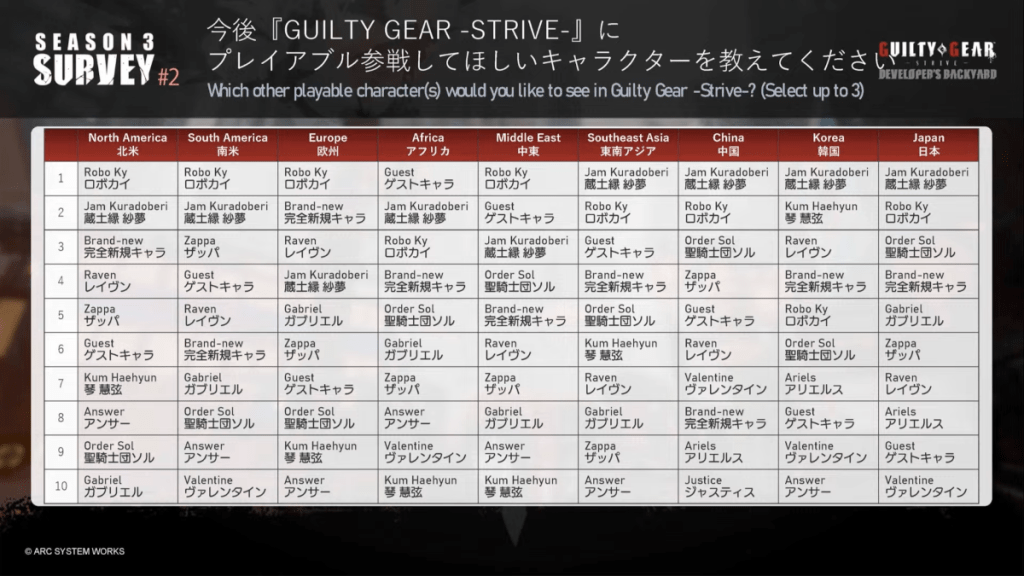 In addition, Arc System Works has published the global poll results for future most-wanted playable characters from the latest Season 3 survey during its TGS 2024 stream. Robo Ky dominated the polls in the West and Middle East, while Jam Kuradoberi topped the list across East and Southeast Asia.