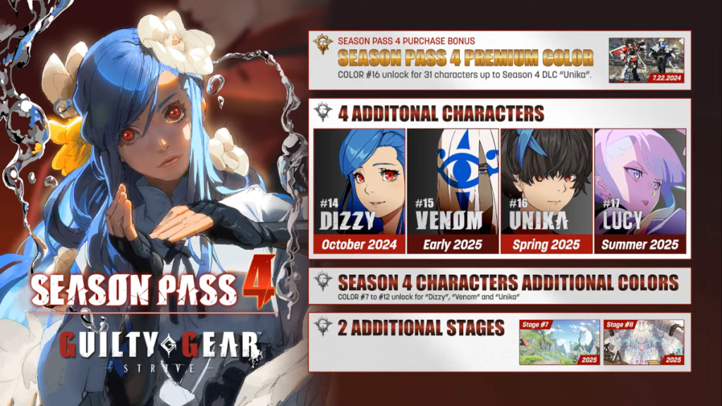 Despite releasing at the very end of the month, this date still goes in line with the October 2024 window announced during the initial full reveal of Season Pass 4 in July 2024. Arc System Works will afterward add Venom in early 2025, the Guilty Gear Strive: Dual Rulers anime key character Unika in Spring 2025, and the Cyberpunk: Edgerunners guest character Lucy in Summer 2025.