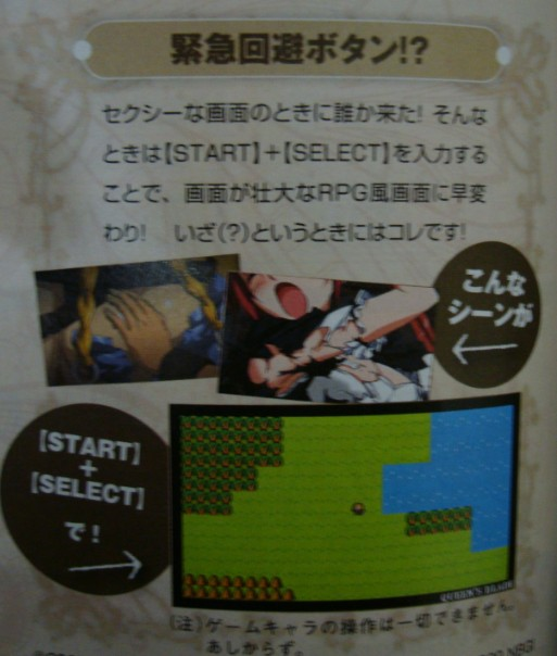 Don’t panic. Use the built in panic button feature. When something not safe for work pops up hit start + select at the same time to temporarily turn Queen’s Blade into a generic looking 8-bit RPG. Basically, it’s a “boss mode” to hide boobs.