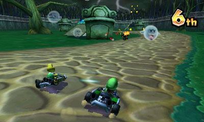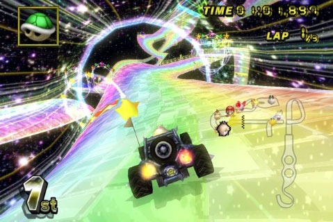 One of the additions to Mario Kart 7 is that you can take advantage of bumps on the road to gain a short burst of speed. This is done using the “R” button. Like previous Mario Kart games, you use the “R” button mainly to drift. As always, if you tap the button, your kart does a short hop off the ground. Time this hop correctly right as you go over a bump, and you’ll gain a speed boost for a second or two. Depending on what track you’re racing on, these bumps are represented in different forms. The roots of a large tree, a log laying across the road, or simply a bumpy patch of terrain. Taking advantage of these can help during races. Speaking of tracks, two interesting ones that have caught my attention in Mario Kart 7 are Rainbow Road and a new track called Music Park.