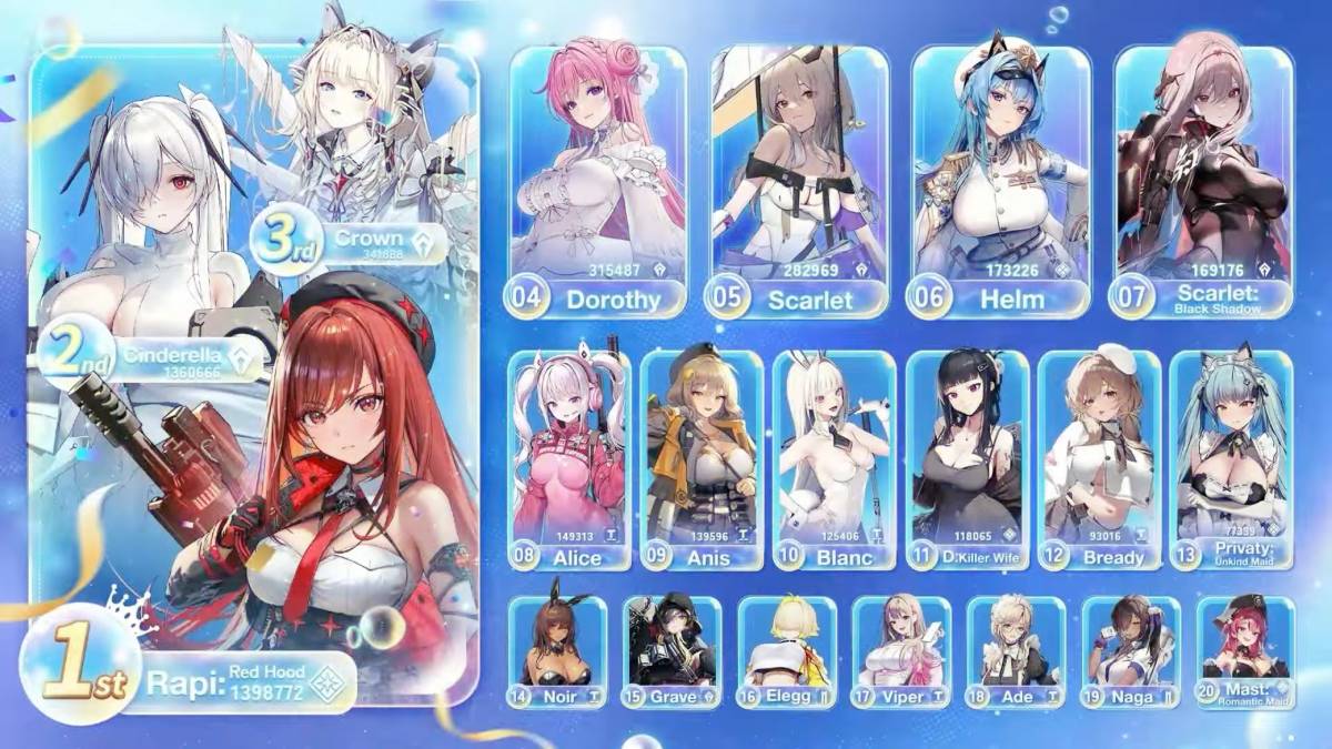 At the beginning of April 2025, Shift Up announced the Goddess of Victory: NIKKE Global Popularity Poll 3 to vote for us to vote for our favorite character, and Rapi: Red Hood won it. The results came up during the 2.5 anniversary stream at about the 33 minute mark of the video. While the official site doesn’t show results yet, there is an image going over the top 20 from run.