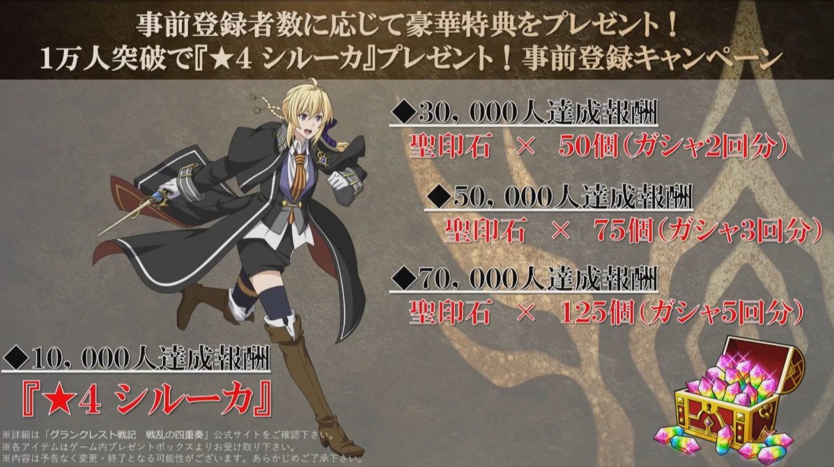 And lastly, there’s a pre-registration campaign going on where you can get a 4-star Siluca for 10,000 registrations, 50 Seal Gems (about two gacha pulls) for 30,000 registrations, 75 Seal Gems (three pulls) for 50,000 registrations, and 125 Seal Gems (five pulls) for 70,000 registrations. Those of you interested can pre-register here. Record of Grancrest War: Quartet of War launches in Japan in 2018 for iOS and Android.