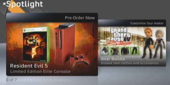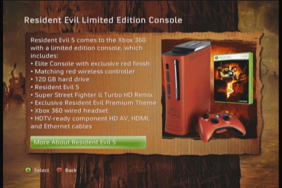 An Xbox 360 spotlight blip confirmed what Ars Technica’s mole leaked last month: Capcom and Microsoft are preparing a Red Resident Evil 5 Xbox 360 bundle. The package contains a limited edition red Xbox 360 Elite (the console with a 120GB hard drive), matching controller, Resident Evil 5 (standard edition), Super Street Fighter II Turbo HD Remix, a headset for online co-op, and an exclusive Resident Evil Premium theme.