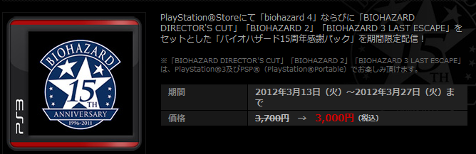 Slated for release on PlayStation Network in Japan is a Resident Evil 15th Anniversary Thank You Pack, which packs four classic Resident Evil games into one discount bundle. For 3,000 yen (36) you can get digital copies of Resident Evil: Director’s Cut, Resident Evil 2, Resident Evil 3, and Resident Evil 4 HD.