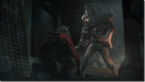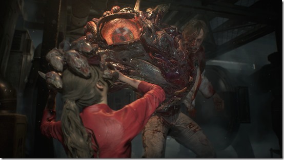 Carefully navigating the machinery and steam coming from broken pipes, it’s hard to tell where an attack might come from next. Conserving ammunition is key, and knowing when, and where, to get a few shots in may be the only thing between survival and certain death in this tense encounter. Sending the creature over the edge will reunite Claire and Sherry, but for how long…?