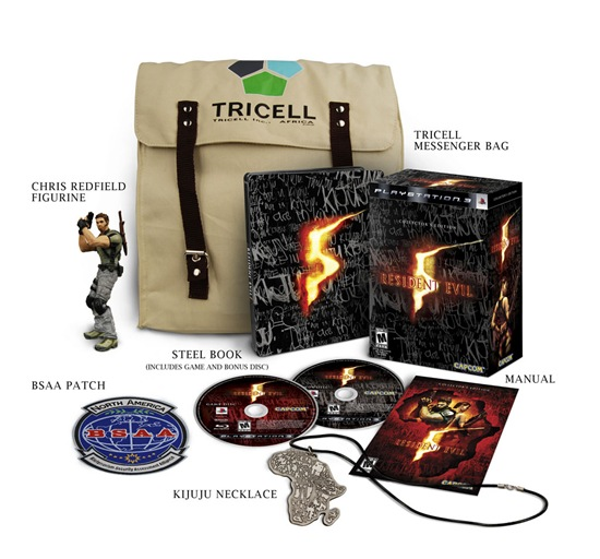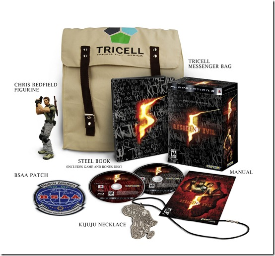 North America and Australia – Chris Redfield figure, BSAA Patch, Kijuju necklace, Tricell messenger bag, bonus disc with making of movie/digital art gallery, and Resident Evil 5 in a steelbook case for $89.99. If you pre-order at GameCrazy you get a bonus sand globe. Australia gets the same bundle for $169.95 AUD ($110).
