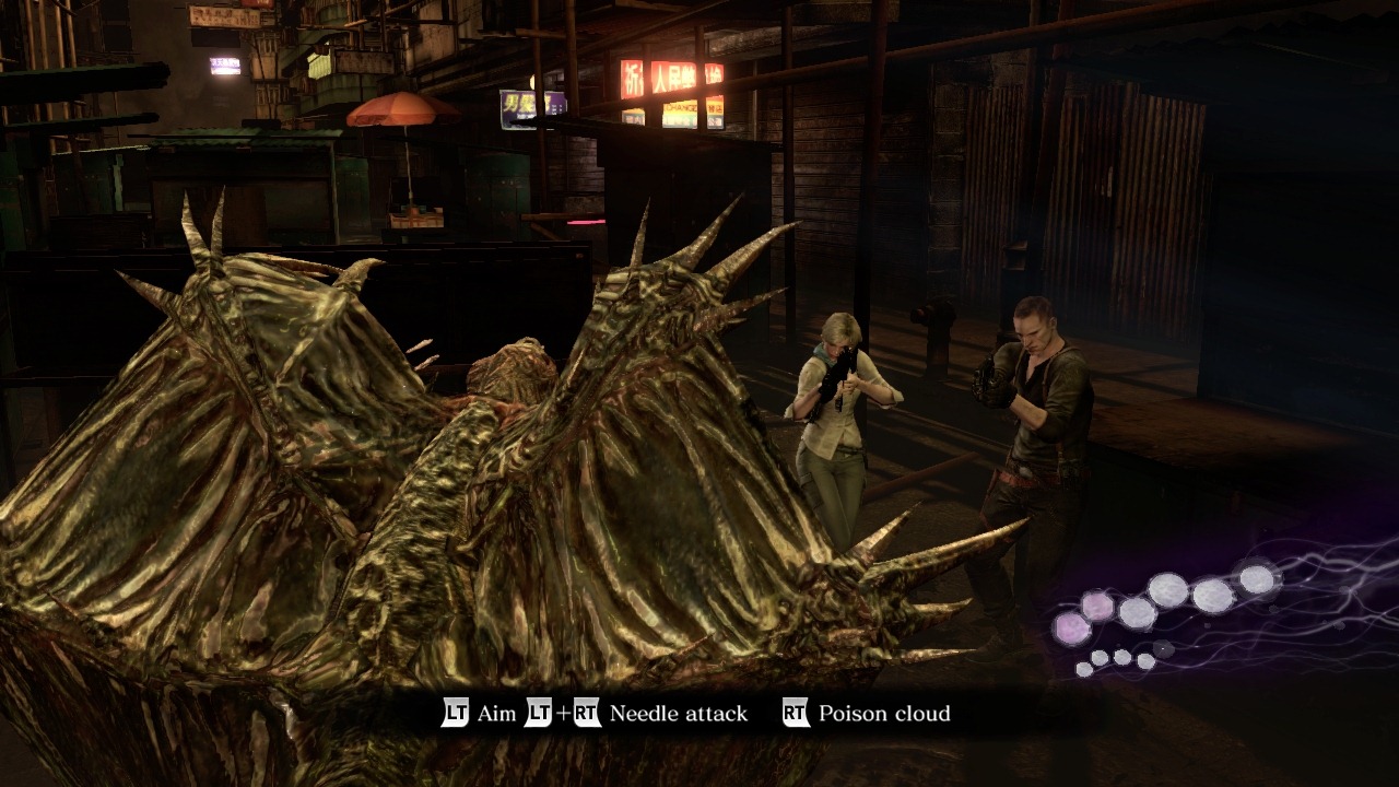 I started with Chris Redfield’s arc, which plays more like a third person shooter with monsters than a Resident Evil game. Chris begins his story sitting at a bar sullen about a past mission and his partner Piers Nivans coaxes him into rejoining the B.S.A.A. Their first mission is to go to Lanshiang in China to rescue United Nations works held hostage by mutants called J’avo. Chris, after pushing a reporter’s camera out of the way, storms into an apartment building with a 909 pistol and a machine gun. He’s ready for a war on multi-eyed monsters, but there’s one problem… ammo is scarce in Resident Evil 6. Well, scarce for the player. There’s a clear contradiction here because J’avo have magical machine guns that never run out of bullets and most areas require players to kill all of the monsters before moving on. I suppose you can wait for your computer controlled teammates to do this, but I took a more aggressive approach and snuck around corners using melee attacks. Resident Evil 6 has a stamina meter and it usually takes three bars to finish off one enemy. So after stomping on two J’avo you have to take cover and wait for the meter to recover. Lanshiang’s markets have narrow hallways that naturally split the J’avo up. The tight corridors introduce another problem, though, due to the control scheme you automatically go into cover mode if you draw your gun next to a wall. I blasted and kicked my way through room after room of J’avo and found the hostages in the hands of spider-like J’avo.