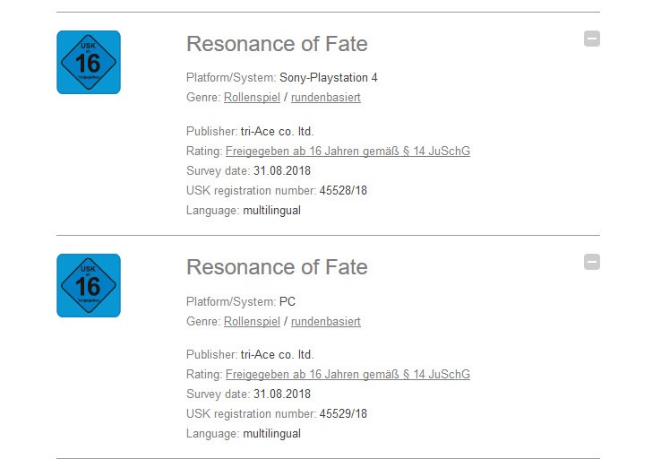 The tri-Ace developed RPG Resonance of Fate released back in 2010 for PS3 and Xbox 360, and it looks like it could be headed to PS4 and PC, as the title has recently been rated in Germany. [Thanks, Gamestalk.]