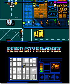 Retro-styled open-world game Retro City Rampage: DX will be released for the Nintendo 3DS via the Nintendo eShop later this month, developer VBlank Have announced via Twitter. The game will be priced at $9.99. The February window is for North America specifically, but VBlank hope to have the game released in Europe this month as well. They tweeted in reply to European fan: “Hopefully feb. Submitted to both simultaneously but [Nintendo of America] was faster to finish certification.” The Nintendo 3DS version of Retro City Rampage has a few additional platform-specific features that have been revealed thus far. An updated map of the city is displayed on the 3DS’ bottom screen, and you can touch the screen to select different weapons. Additionally, while important displays such as health and objectives are displayed on the top screen of the 3DS, other elements of the HUD have been moved to the bottom screen as well. Adjustments have also been made to the game’s camera. VBlank also say that Retro City Rampage: DX (which we assume stands for “deluxe”) will include other new features that will be exclusive to the 3DS version, and that there are no plans to port them to other platforms at the moment. Note, however, that the 3DS version of the game will not support stereoscopic 3D visuals. You can read about the reasons for this here. Retro City Rampage is already available for PC, Xbox 360, PlayStation 3, PlayStation Vita and Wii. You can view screenshots of the 3DS version below.