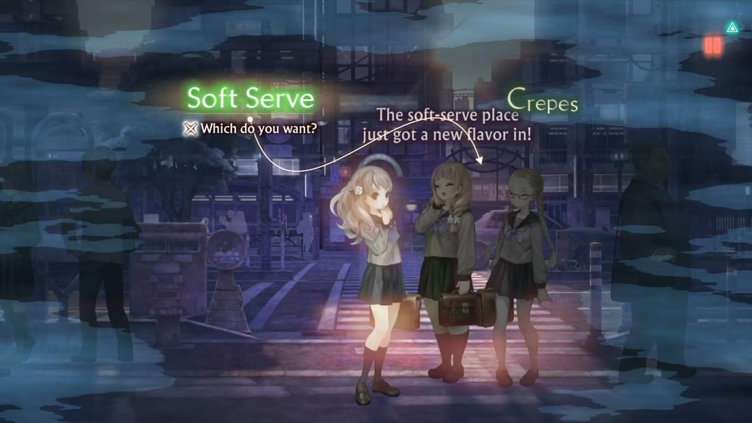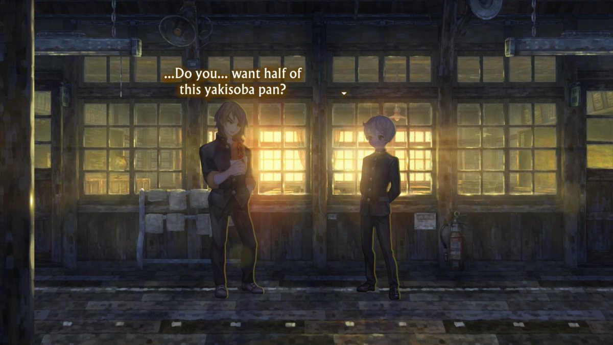 The basic premise is this. Kaiju are invading various periods of time, targeting mysterious terminals. A number of high school students get caught up in these battles and find themselves in the pilot seats of massive Sentinel mechs. This also all happens while James Bond-levels of intrigue and subterfuge and science fiction elements like androids are woven into the plot. By the end, some of the potential twists might make a lot more sense and others could still feel like huge surprises. But it definitely pairs coming of age elements, like Iori falling in love at first sight and certain characters growing up and into the people they were meant to be. It very much feels like an visual novel, though it would be more accurate to describe it as an adventure game. Everything is intertwined and it can feel like there’s a real butterfly effect in action. As characters go about their lives, investigate, and speak to the people around them, they will build up their Thought Cloud vocabulary. There, names, terms, and ideas will come up. You can think about them to learn more or apply them to certain conversations/items to advance the plot and pick up on more lore and evidence. As you go through everyone’s stories, you develop better outlooks on each cast member and move their plots forward too. It’s engrossing and rewarding. “What will I learn about Megumi and her goals this time? What about Nenji?”