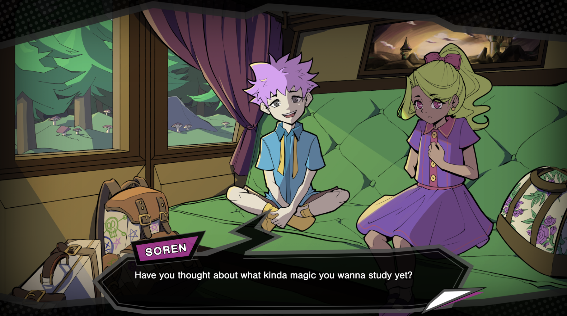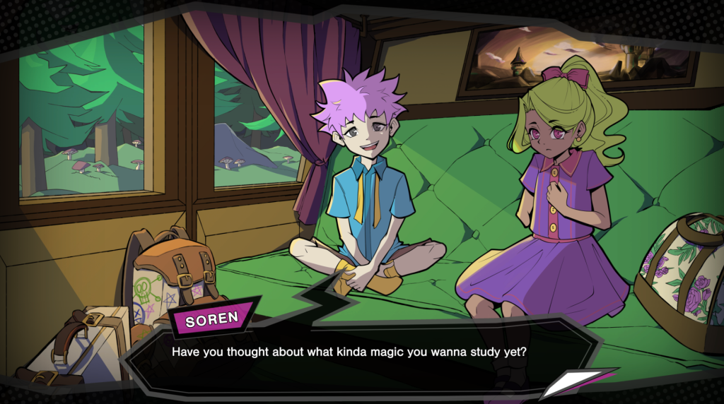 After deciding what our character looks like, via choosing body type, pronouns, magical specialization, and hair/skin/outfit colors, we watch as they head to Seven Winds Academy in a carriage with fellow students Nina and Soren to begin training to become mages. They make a promise to support each other as friends. Fast forward to their senior year, and that seems true! However, things seem extra strict at the academy this year. There’s pressure to make the tests harder than usual, and students are desperate to not fall behind. After falling asleep in a class and getting assigned to an Illusionists division storage closet cleanup with Nature Mage (and returning Arcadia Fallen character) Kim and Tinkerer Puk, all three find themselves in a pocket dimension that’s home to a small dragon named Ragnar. In exchange for helping him retrieve an important item, he’ll help them teleport to a professor’s office. However, it’s only the start of a trio that will grow to a group destined to potentially start a movement.