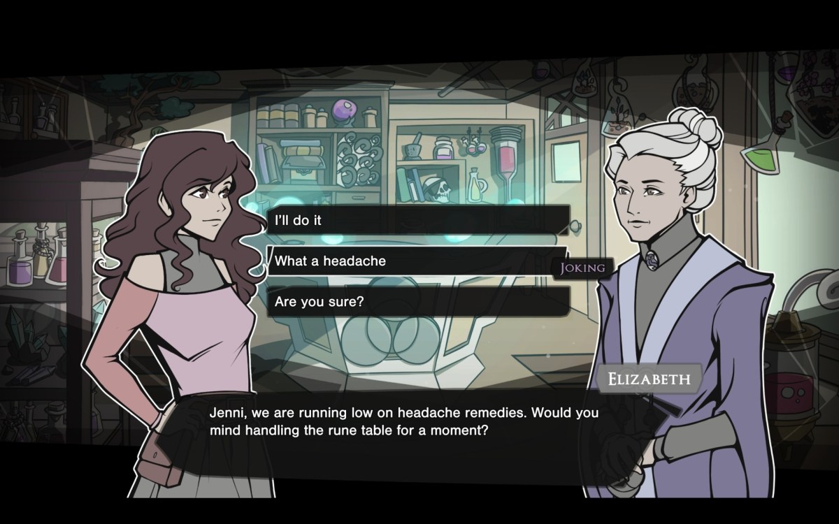 Crowdfunded games tend to be titles that attempt to offer something different. They sometimes feel like they might not exist otherwise. Galdra Studio’s Arcadia Fallen is that sort. It attempts to take people on an adventure while challenging them with some puzzles and offering opportunities to bond with (and romance) allies. However, it also provides a chance to shape a protagonist’s personality with answers, have multiple “correct” answers, and shape a story while letting someone be themselves. While it might not be entirely revolutionary, it accomplishes its goals and tells an interesting story. An alchemist’s apprentice lives in a small town, helping their mentor make potions for the community. However, since this is a world where people are suspicious and apprehensive, sometimes even fearful, about magic, it isn’t exactly peaceful. Some people are afraid of the two of them, as well as the nature mage running a local flower shop. After stepping in to assist a mysterious young woman being harassed, they end up bound to her. Turns out she is a spirit named Mime. Not only does this put a target on the alchemist apprentice’s back, but it results in them getting caught up in troubles around the town. Turns out only they and the group of friends they recruit could save the day.