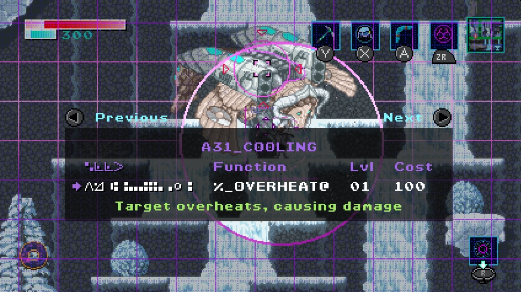 Like Axiom Verge‘s “glitch gun,” Indra can send out a cloud of nanomachines to hack any enemy she encounters and a number of objects in the world. These hacks amount to the ability to select from a number of options to affect an enemy with. These range from opening or closing a door, to slowing down or causing an enemy to self-destruct. Even boss-class enemies can be hacked, shutting down their weapons and rendering them harmless enough to be bypassed easily. Indeed, bypassing fights is an entirely valid option in Axiom Verge 2. No longer are areas gated off by unavoidable boss battles, rendering some of the game’s biggest and most complex enemies mostly optional. As a whole, combat seems quite de-emphasized in the sequel compared to before, with the game’s design favoring the removal of obstacles that could fully roadblock a player’s progress.