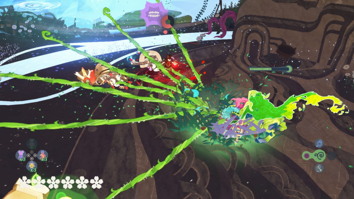 This is handled by basically tying the left Nintendo Switch Joy-Con to Cereza and the right to Cheshire. This might seem like it could be a confusing and hand-cramp-inducing situation! However, PlatinumGames executed in a way that makes the whole process rather fluid. While the action buttons and D-pad on each are tied to different actions, they aren’t frequently used ones. Cereza can use Umbran potions with the D-pad, if she happens to have any on-hand, while Cheshire can switch between elemental forms with special capabilities with the A, B, X, and Y buttons. Primarily, someone will be using the L, ZL, R, and ZR triggers for almost every action, as well as the analog sticks to move. While exploring the woods, movements usually are pretty much in-sync or involve moving one character at a time, which helps. Not to mention there’s the efficient Hug Mode that sees Cereza carrying Cheshire in his plush toy form to make things easier and help require magic. The only time it can really get frantic is when facing foes like fairies. During these fights, Cheshire can use his standard or elemental abilities to attack enemies. Both the fire and water forms involved ranged attacks, while the grass and stone ones can involve more melee ones. Cereza is on the field as well during these times, with players left to continually assault opponents while she uses thorns to bind them both to hold them in place for Cheshire and keep them from attacking her. In boss fights, these experiences can become more like a dance, with specific moments when tying a foe down can mark a critical chance for Cheshire to strike. It sounds like a lot, and it is! But to my surprise, it all works exceedingly well.