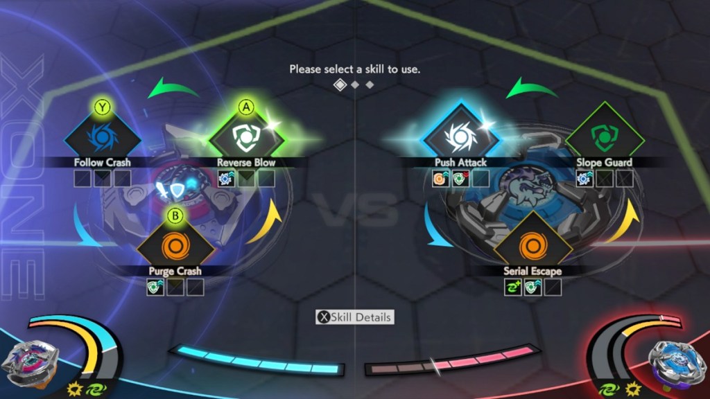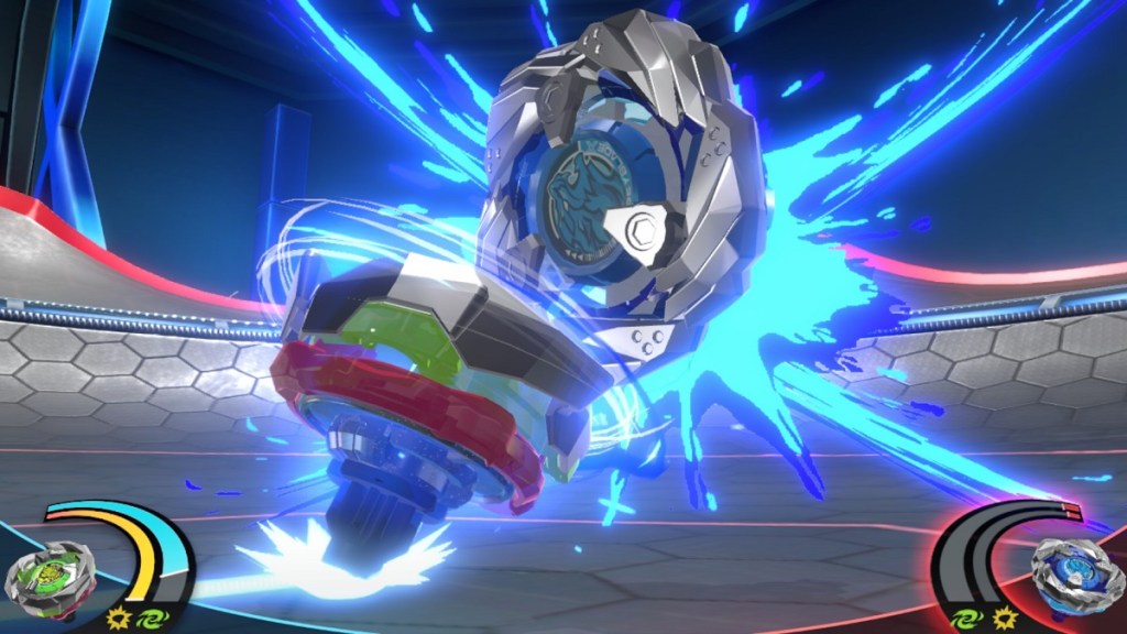 When the Beyblades are launched into the stadium, they will move automatically. If they collide with one another, they will take damage. Each Beyblade has the equivalent of two health bars: the spin gauge and the burst gauge. The spin gauge represents how long the Beyblade can stay spinning, and this bar depletes over time. The other health bar, the burst gauge, indicates how many hits the Beyblade can endure before it breaks into different pieces. One point will be rewarded if the Beyblade stops spinning, and two points will be awarded if it bursts.