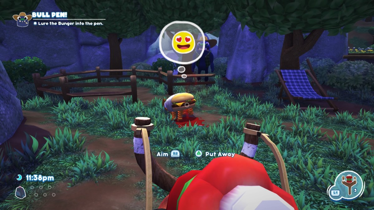 It’s a game where things are generally fine and work well enough. Your menu keeps things organized, showing quests connected to each person and a Grumpedia that tells you about the island’s residents. Catching Bugsnax is fairly simple. It moves at a good pace. It is a tad buggy, for lack of a better word. I had to quit and reload a save during the initial catching tutorial, as a certain Strabby decided to not respawn after an incident with a Green Lollive and a trap. In another instance, Sprout, the Strabby in a ball, ended up basically being knocked into next week by another bug chasing it. Trying to summon my buddy back wasn’t working, but exiting and reloading.