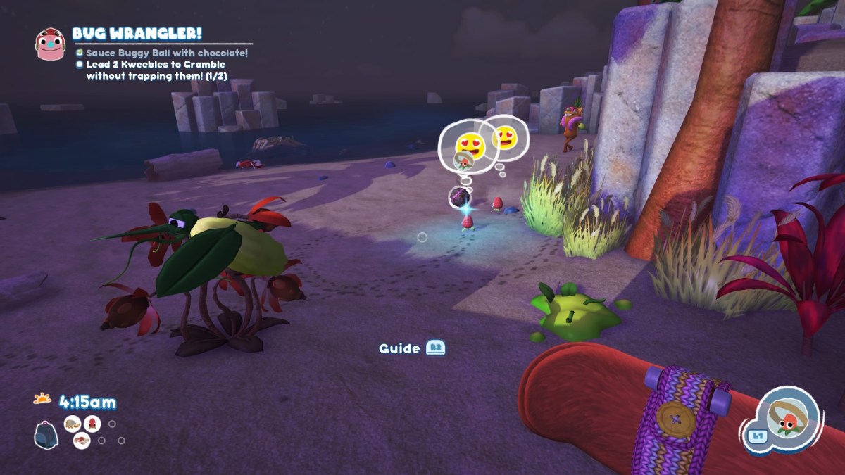The earliest example comes with the Bunger, which is too large to catch in a trap. Its fanatical about ketchup. You can use that to make it attack other Bugsnax or environmental items so you can perform other catches. But eventually, you might find yourself coating a Strabby in a hamster ball in chocolate sauce to force a Kweeble to visit a certain area. Like Pokemon Snap, it comes down to timing, knowing your prey and figuring out the puzzle that makes it behave the way you want it to.