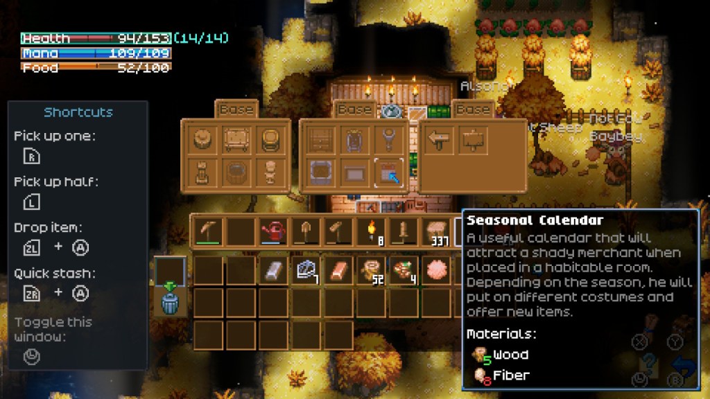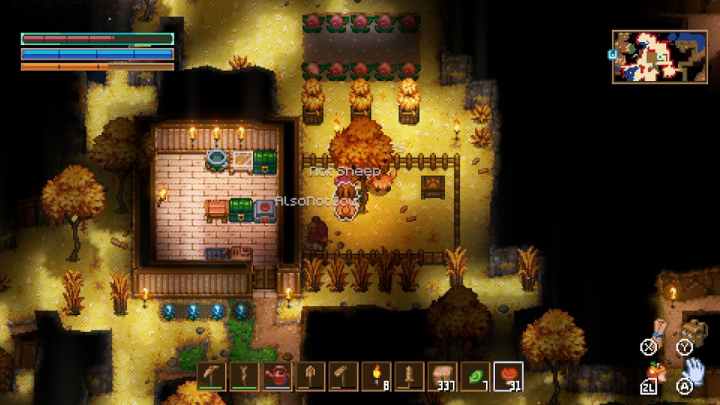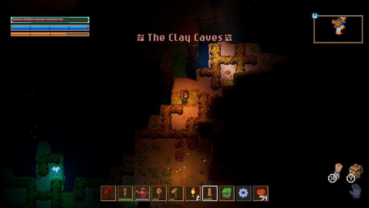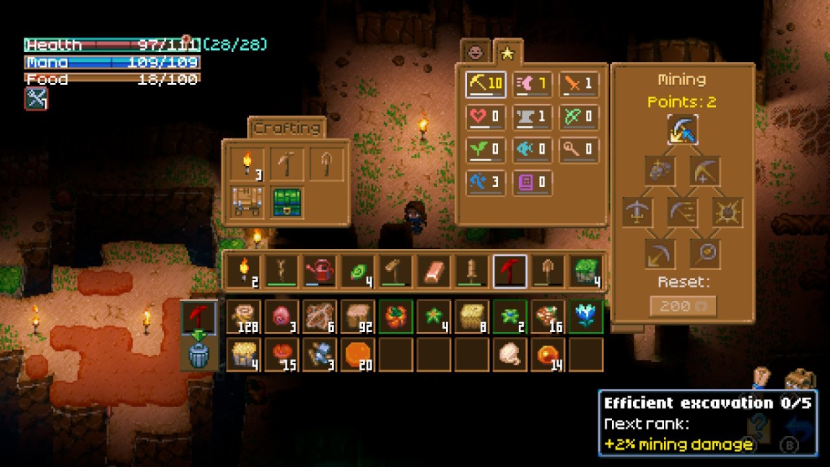 Its perspective and elements of its execution set it apart. As it is a creative, survival sandbox game, you need to worry about your health and hunger in any mode that isn’t about just exploring and being creative in the environment. You’re seeing things from an overhead perspective, and initially have limited information about the area and no tools. The branches covering the relics ahead of you can be used for initial items like a pickaxe and shovel, though even punching walls allows you to get the materials needed to create workbenches and crafting tables to start making ore and stronger stuff. As you go on, you’ll find different biomes with unexpected enemies, opportunities to even farm by finding seeds or certain items, or ways to attract merchants to move into homes built for them. The map automatically updates, much in the way Terraria does, to make it easier to track everything.