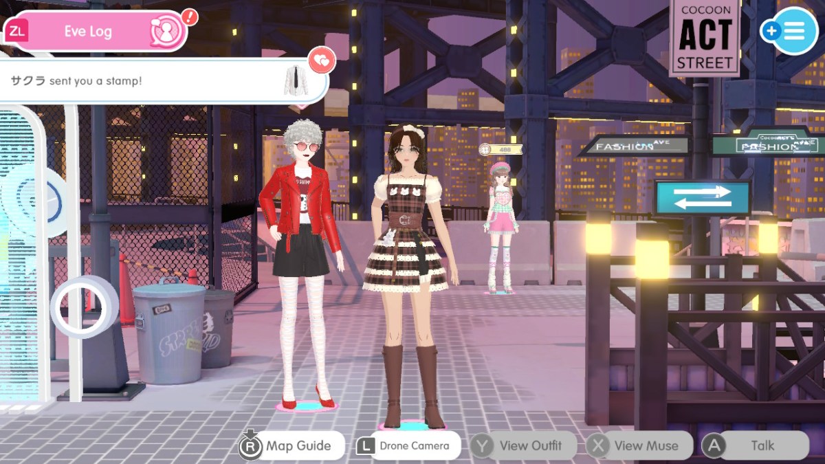 While Style Savvy saw players running a shop, getting more involved in clothing customization, doing more to meet specific genre, element, and design needs for other people, Fashion Dreamer strips that back for this entirely new Switch experience. Instead, players craft a Muse. This avatar explores rather empty streets in a metaverse-like virtual world, with four hubs known as Cocoons each offering their own vibe. There’s no shop. The clothing items are more limited. The other Muses’ requests are less restrictive. There are no competitions at launch. There’s no goal beyond “more notoriety.”