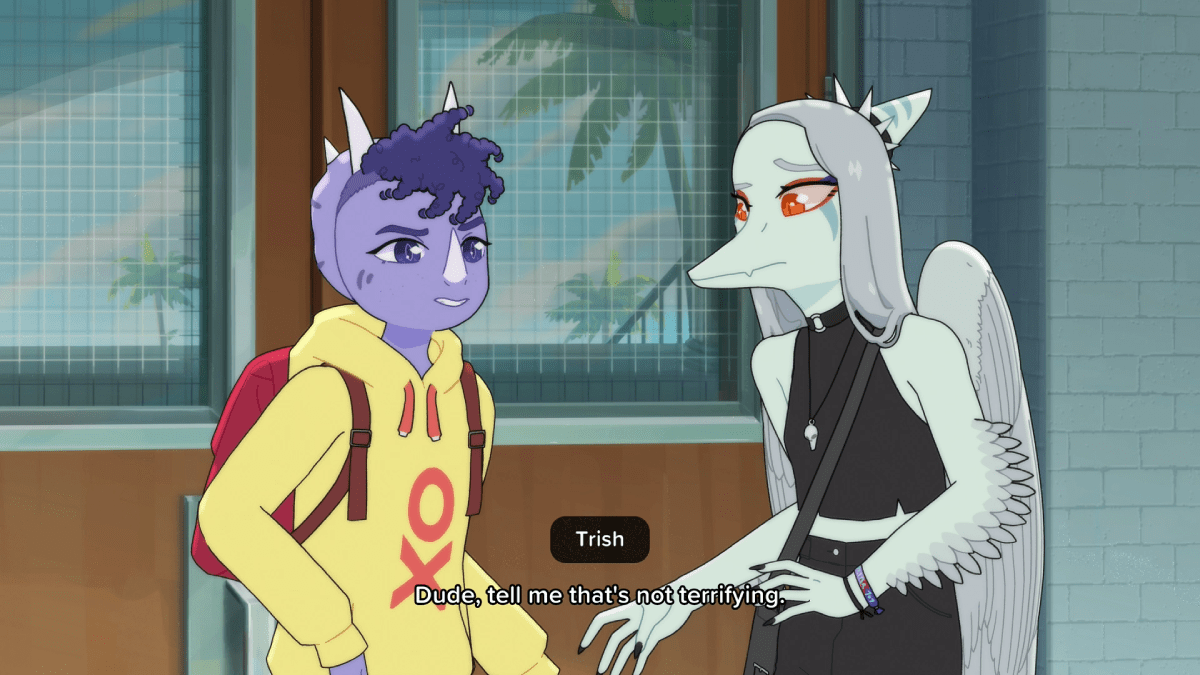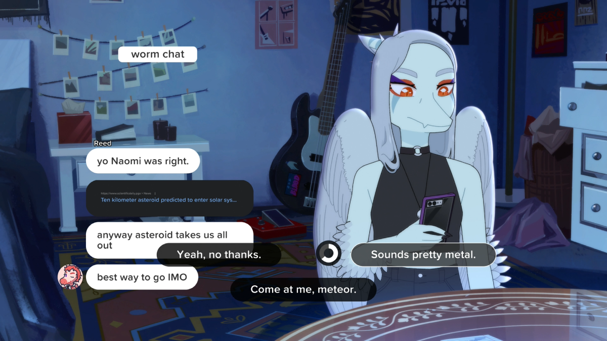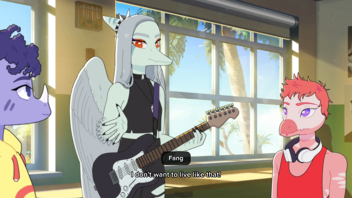 Goodbye Volcano High is a game with an intriguing premise. This teen drama game stars dinosaurs figuring out their futures while a visitor from space threatens to end them prematurely. If you don’t know how the Cretaceous period ended, then spoilers lie ahead, but things don’t look good for our protagonists. Goodbye Volcano High is what happens when someone plays Life is Strange and thinks it needs more dinosaurs and a much larger environmental threat. You play as Fang, a young musician entering their senior year of high school with big dreams of going on tour and singing for millions of adoring fans. However, as the year progresses, they have to deal with friendship drama, a mysterious secret admirer, and self-esteem issues. This all happens while the news talks about an asteroid hurtling straight towards the planet.