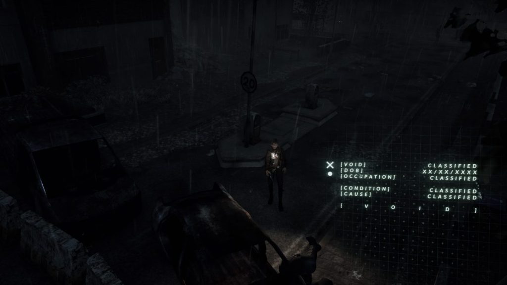 The best thing about Hollowbody is arguably its presentation. The game looks great and the atmosphere of this alternate universe UK is brimming with a foreboding feeling. The combination of noir and cyberpunk elements is a match made in heaven and the menus and UI elements are great. I found particularly interesting the HUD that appears when you find remains of a human body, telling a brief story of who they were and what happened to them. Even though I said that the game is mostly vibes, fortunately these are pretty strong. I also need to point out that Hollowbody was developed by a single person in its entirety, which is absolutely impressive.