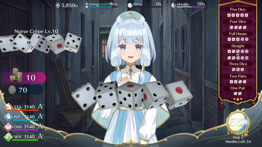 I believe the way in which stats are handled and displayed in Magical Princess makes the management process come across as less intimidating than in Princess Maker and similar games. On the main screen, you always see Stamina, Intelligence, Charm, and Sensitivity bars. These let you see at a glance what fields she’s leaning into. However, in the menu and any class and job screen, there are more specific details. The STA stat is influenced by her Vitality, Vigor, Strength, and Speed stats. INT is based on Literature, Math, Magic, and Piety. CHA is tied to Beauty, Manners, Sociability, and Virtue. SEN is linked to Imagination, Musicality, Creativity, and Art. Her Battle stat is kept separate and increases as her HP, Attack, Defense, Speed, Stamina, Dark Magic, Light Magic, Magic Resistance, Incantation Speed, and Luck rise. We can also factor in her bonds, buffs from male and female relationships, and general renown. But because there are those letter grades and general figures on-screen, we can tell at a glance if someone is going to be more of a social butterfly, a warrior, a scholar, or an artist at a glance and sort of course-correct if we see certain general letter grades getting too high or low. That grouping also helps you figure out which stats work together and fall into the same group for certain goals, which is handy.