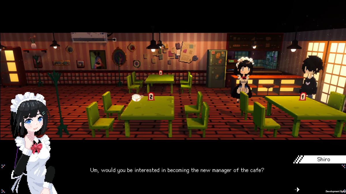 Especially since Maid Cafe on Electric Street is an exceptionally pretty pixel-art game. Everything is presented from a side-scrolling sort of perspective, where we’re looking at it all as though we’re watching a drama presented on a screen. The sprite-work is fantastic, especially when it comes to environments. It is really good at setting a move and building ambiance.