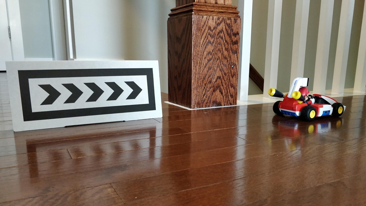 You can also customize your racer, to a degree. (At least digitally.) Since Home Circuit animates Mario on your screen and covers up the real kart when it does, it can make Mario wear a builder outfit or drive a cardboard kart. That’s fun, to a degree. It doesn’t affect gameplay, and we do wish we could put some creativity into the plastic thing careening around the room. (We also would love to be another character! They’re never going to make a Koopa Troopa kart.) As amazing as Mario Kart Live: Home Circuit can be, that experience is highly dependent on, well, your home circuit. First: the game benefits from space. While tracks don’t need to be too long, the more space you have, the more creative you can be in making new courses for yourself. That’s definitely the primary appeal of the game, rather than the driving itself, and you’ll play longer if that remains fun. Second: surfaces are crucial. The ideal for Home Circuit is a smooth hardwood floor. It can handle some uneven tile and even very short carpet fairly well. Thick carpet makes the light kart bounce around as it moves, progressing slower than computer opponents and causing all sorts of detection problems with the shaky on-board camera. Rugs or inclines? Nah. The kart isn’t powerful enough to manage those transitions without some real help. It could probably do these one-way, but since the game insists that tracks are a full loop, that isn’t enough. Besides those two main factors, you’ll really need good lighting so the visualizations render well. You’ll need strong wi-fi connections so your camera doesn’t constantly cut out. And, well, you’d do well to bring an understanding that this is a toy. People who enjoyed Nintendo’s Labo releases will probably find fun here too, as both are about the joy of building and enjoying physical interaction with games. There are elements like time trials here (mostly included to allow families to buy one set and still compete for times and play together that way), but gameplay mastery isn’t the big draw here.