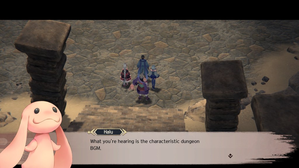 As a fan of the franchise, it was a joy just to browse the game’s glossary and read term and item descriptions. It was also great to see the game’s world expand beyond the nations of Yamato and Tuskur that we’re already familiar with. Seeing the origin points of certain quirks for these characters I had grown familiar with over the course of the Mask duology felt like getting to know them even better. I never knew I wanted to know where Oshtor and Mikazuchi got their disguised personas from, or to see who inspired their first naked drinking party, but I do now. I just don’t know if that sense of deepening connection be as there for a person using Monochrome Mobius as their first brush with Utawarerumono. If you’ve the time, I would highly recommend playing the other games first, or at least trying out their anime adaptations. If the game sticks close to home when it comes to its narrative and world-building, it goes much farther afield when it comes to its mechanics. The other Utawarerumono games were visual novels with a tactics-game layer to facilitate battles. Monochrome Mobius is a traditional JRPG. You’ll pilot the party of Oshtor, Munechika, Mikazuchi, and Shunya across open fields, moving from place to place in pursuit of the next side quest or cutscene. Along the way you’ll fight a ton of roaming monsters, buy new equipment (or improve what you’ve got), level up, learn skills, find treasures, navigate dungeons, and fight bosses. It ticks off every box in that big checklist of “Things JRPGs should have”. One character even makes a couple of jokes that all but mention Dragon Quest and The Legend of Zelda by name, signaling that “Yes, we’re doing this thing because we’re in a JRPG.”