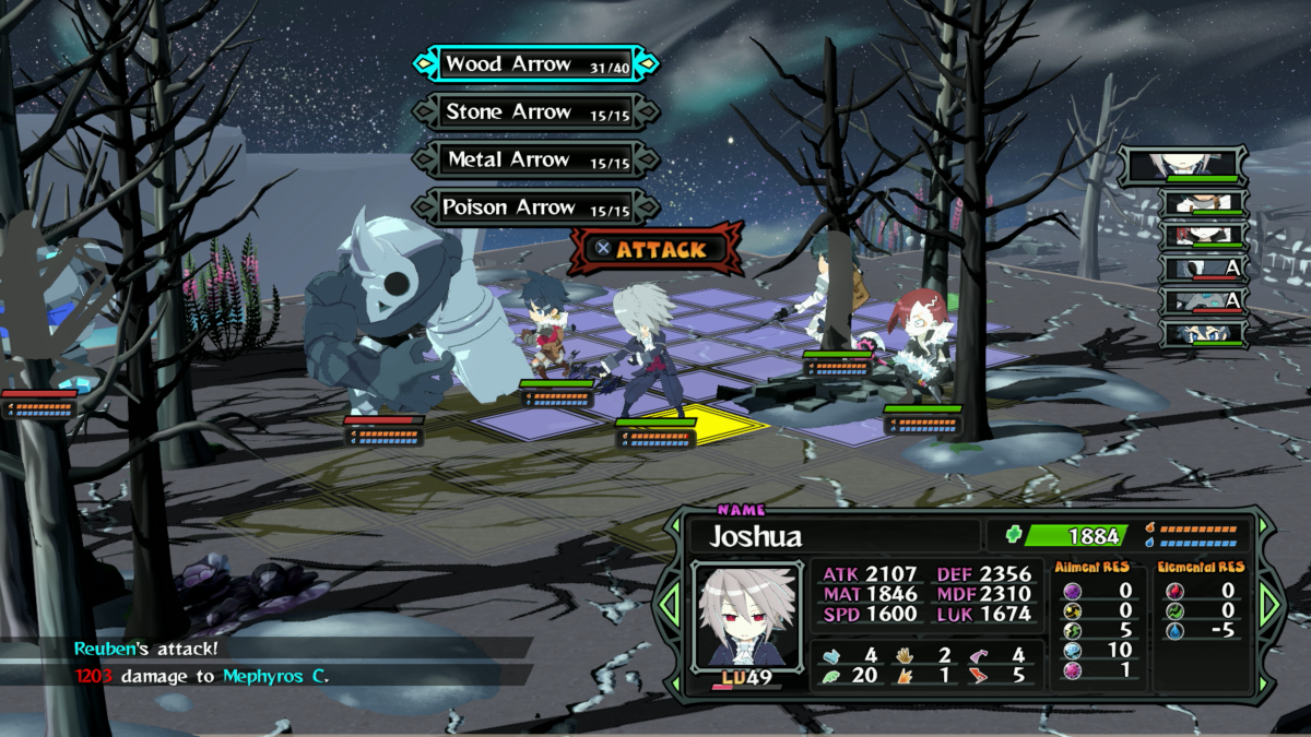 In many ways, you can feel Monster Menu’s “mystery dungeon” roots. Floors are randomized. Depending on the difficulty you choose, you’ll have different modifiers adjusting the difficulties. You start from scratch, but some meals improve base stats. Actually facing the Sealed Lands with a party helps with survival. Things like exploring and fighting wear away at characters’ Calories and Hydration meters, which you need to refill with foods and drinks. Unlike similar roguelikes, there’s no “they only move when you move” element, which means needing to be more alert around enemies. However, while you do return to level one and drop ingredients when you die, you will still keep the equipment you found and recipes you learned. However, there’s a much greater focus on food and keeping those basic need bars up, which really makes Monster Menu feel different from its contemporaries. Fighting monsters and gathering items in the dungeon will net you ingredients. These can be cooked to make shockingly realistic and sometimes disgusting dishes with various monster parts. Eating them increases stats and teaches skills a character, though I’ve found it best to wait and do so when the increases would be permanent. It’s also surprisingly complex, as the quality and freshness of the materials you collect, the cooking skills of the character acting as the chef, and the preparation methods all alter the outcome in various ways. This means the variety of recipes can feel a lot larger than it is and offer more options when building up your party.There’s also the whole “just eat the enemy you beat” element, which involves “devouring” the foe you just killed, scales, tentacles, fur, and all. Speaking of battles, Monster Menu is unique in that you aren’t just taking part in more active fights like in, say, ZHP: Unlosing Ranger vs. Darkdeath Evilman. Upon touching an opponent, it and all enemies in the immediate vicinity all become your foes in a turn-based, tactical battle. Your attacks have various ranges, there’s a turn order to follow, you can select various skills, and there are follow-up chain attacks if party members are in range when you land a hit. There’s also some degree of “numbers go up” in effect, provided you’ve eat meals, feasted on fallen foes, and have certain equipment, but it’s never as egregious as it is in Disgaea games. It all tends to work well, but also depending on what you find and eat or who shows up, it might not always feel as balanced. (But then, randomization can make that an issue.) However, there are some ways in which the nature of Monster Menu works against it. For example, part of the appeal of a roguelike dungeon-crawler is that it still ends up being relatively fast-paced. This means that even though you may sit for hours playing through run after run as you push further into the depths, it doesn’t really feel tedious. Because every battle becomes a turn-based tactical affair, it draws things out a bit, As a result, I felt like the pacing could be a bit off, because early on some of the “weaker” enemy fights might take a lot of time and leave me wanting to take breaks between each dive.