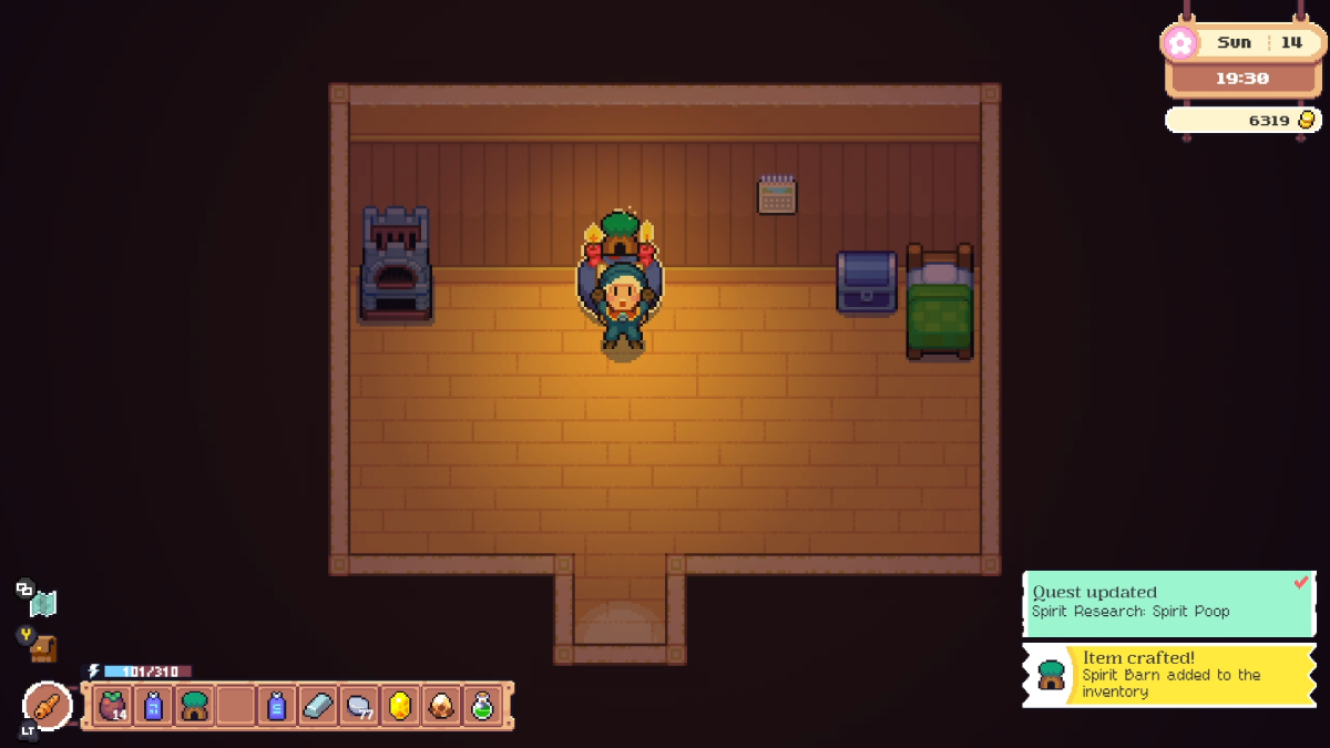 However, once again this is where Moonstone Island fails to live up to its obvious influence. I encountered some early frustrations when I found myself unable to head out and do some monster collection, despite being encouraged to. You see, you can only carry three Spirits in your medallion, and you can’t store any more until you build a Spirit Barn. Building this requires a whole questline, a ludicrous amount of wood and stone, and some rare items that mean you’ll be a few hours into the game before you can really engage with one of its main selling points. Oh, and you’ll also need to build feed boxes for each slot in your Spirit Barn before you can catch more Spirits. In other words, you’ll be doing a lot of busywork simply to obtain an electric bee.