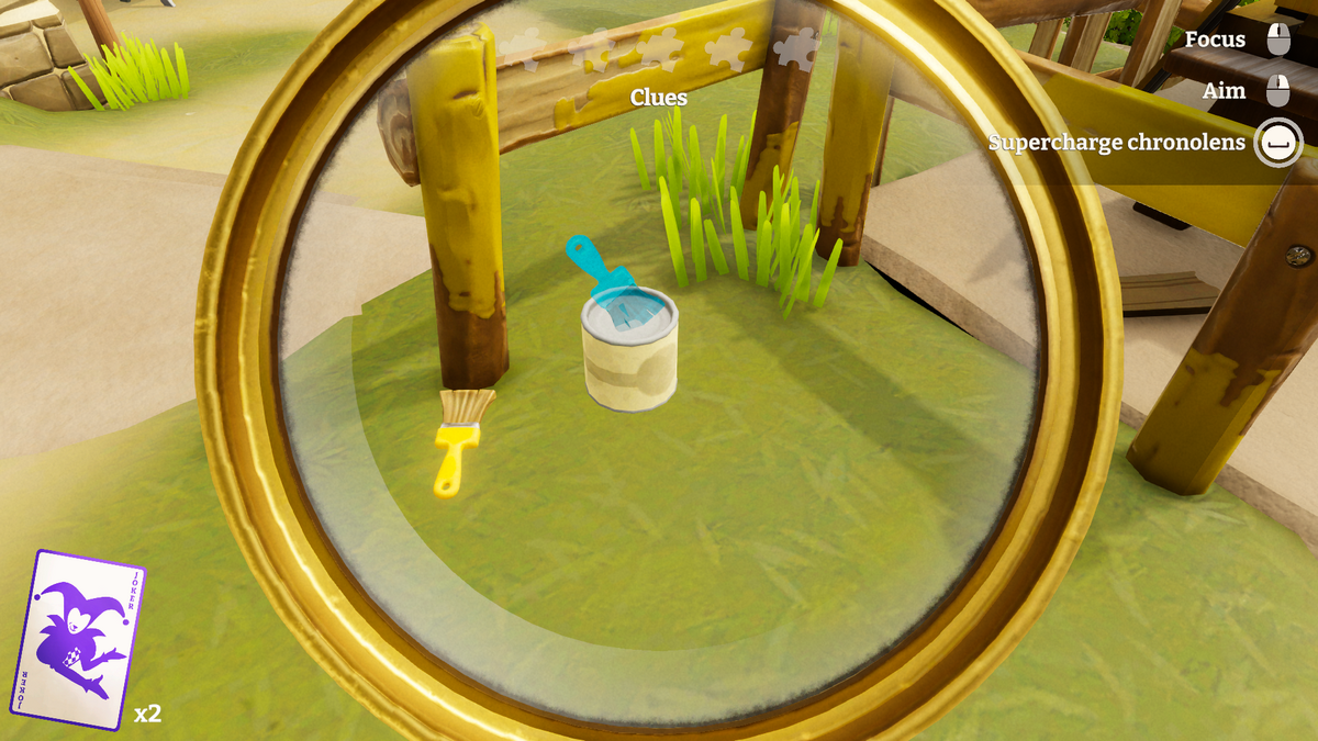 To collect clues, you have to investigate a crime scene with the chronolens. The chronolens shows you if something changed between the past and present. For example, it’ll show you that a map used to be on a car, or that a pew got moved. These are the clues that’ll help you later on. But the chronolens can be difficult to use, since the game wants you at a particular angle before it’ll register you found a clue. Some differences are so minor I could only find them after expending a joker card for a hint.