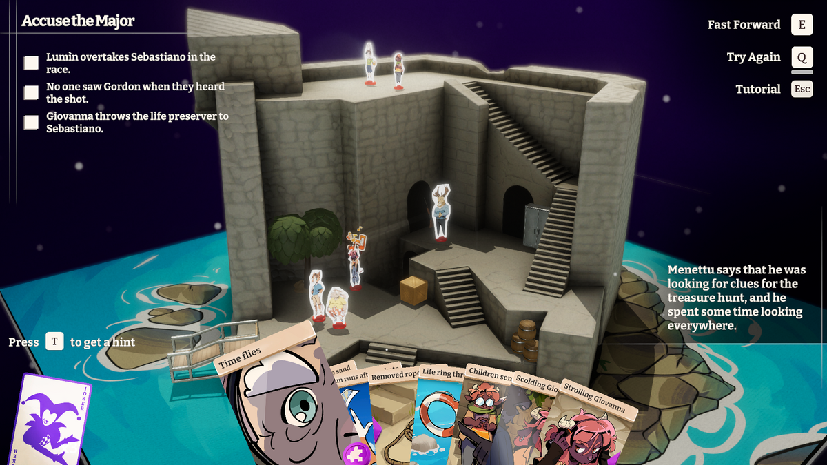 After collecting cards, you enter a 3D diorama of the scene. You have to put the cards in order, or combine them with other cards, in order to recreate the crime scene and find the culprit. Failure is part of this procedure, since you might not know the full situation until you play through it once. For example, I didn’t know how long a smoke bomb would last in one mystery, nor did I know how an NPC would move in another. The cards, too, sometimes acted in different ways than I expected, meaning I had to test them in the diorama before I could get to solving the mystery. At times, it involves more guesswork than actual detective work, and because the animations can take a long time even when you fast-forward them, the process feels longer than it should.