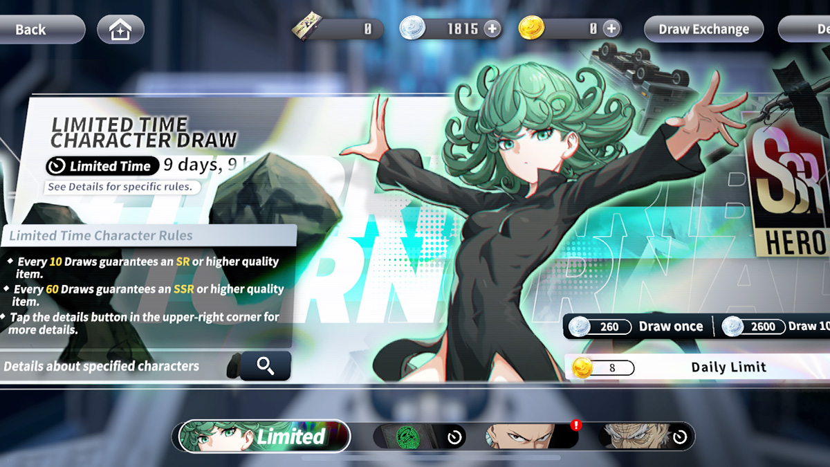 For those who want to spend their hard-earned cash, the gacha system is pretty straightforward. In One Punch Man: World, you spend “World Silver” currency on banners called “Character Draw.” For every 10 draws, you are guaranteed an SR or higher quality item. For every 60 draws, you are guaranteed an SSR or higher quality item. So there is at least some kind of cushion if you don’t get the character or item you initially wanted. For those who want to earn their character draws by just playing the game, it also means a user can save up their Silver over time and have a high chance of getting the character they are looking for.