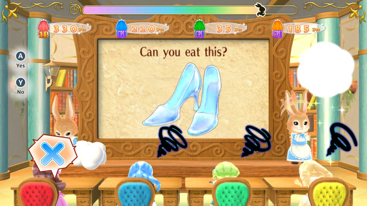 The minigames themselves are basic, but serviceable enough. Each one pits you against three NPC princesses who once lived in the castle, none of whom are particularly skilled. Study has you answer yes or no questions, like “Is this red?” or “Can you eat this?” (That’s… tricky to answer when the picture of the horse comes up.) Decorating cakes involve following the correct order of ingredients. Archery involves hitting targets and not the occasional rabbits walking around. (Why are they on an active archery range?)