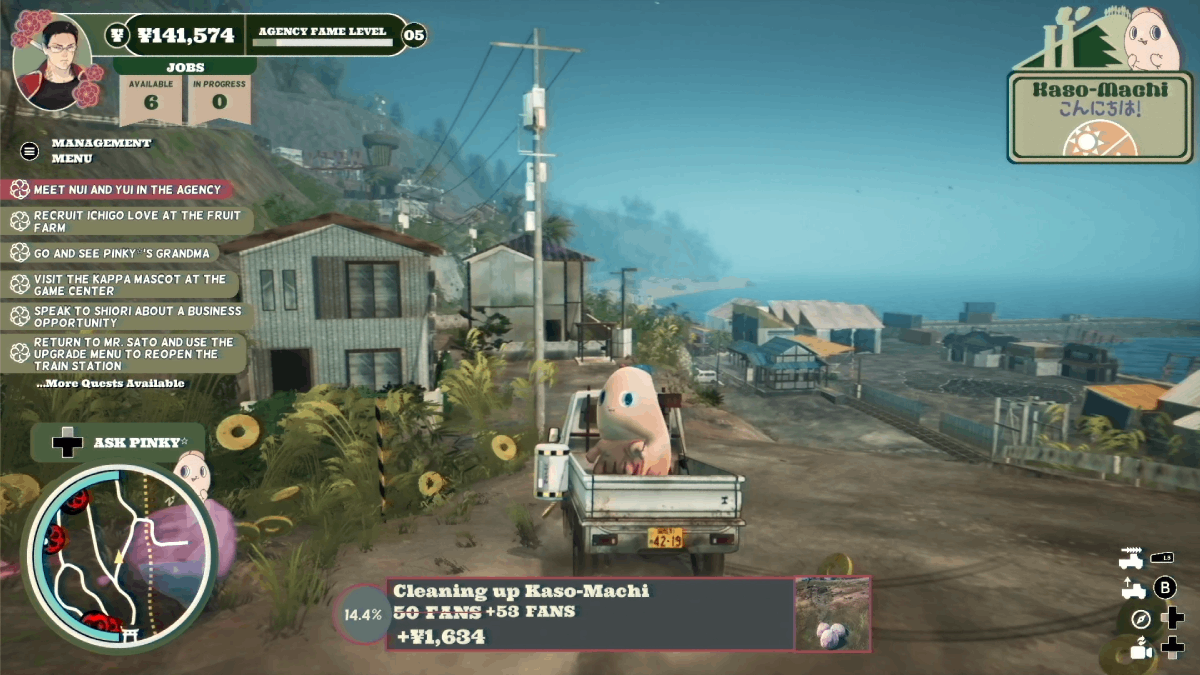 Here’s how it works. You drive your little kei truck around the town, finding unemployed mascots and offering them contracts. Once hired, mascots can be sent on jobs with local businesses. You can then use the money to invest in improvements to the agency, which brings in more money and fans. You can also use your money to invest in the town itself, causing business to pick up, creating more work for you. You also need to send money back to your matriarch as often as possible, to prevent the debt collectors showing up and breaking everyone’s kneecaps. Also, occasionally you have political debates as Pinky attempts to defeat the town’s corrupt mayor in the upcoming election.