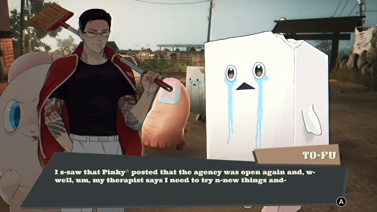 However, it does still manage to carve out its own space within this. Unlike Paradise Killer, Promise Mascot Agency is a lot more grounded in reality. This may be a world where you can bump into a walking tofu block or a vampire made of shaved ice, but their stories are painfully real. Everyone in this town is suffering from government corruption and mismanagement of rejuvenation funds, something that you’re constantly working to combat. It maintains a dark sense of humor about it all, particularly with Pinky’s frequent asides about burying the mayor in a shallow grave. It’s definitely not a dour experience, as the cast is full of lovable oddballs always up to some kind of shenanigans.