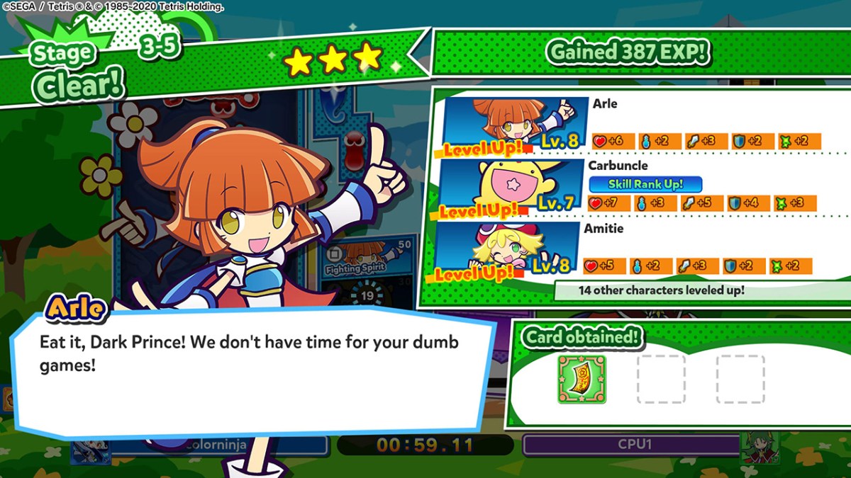 The primary new option here is Skill Battles. In this mode, you’ll equip a party of three characters and a few item cards, and use special abilities and puzzle combos to deplete foes’ HP. This is a very cool idea! Games like Tetris Battle Gaiden and Puyo Puyo~n showed how cool special abilities can be in puzzle combat. The Japan-only Puyo Puyo Chronicle put RPG elements into Puyo Puyo with solid results. So if the team really committed to the idea, it could carry this sequel. And therein lies the problem. While it’s an interesting concept, the implementation here in Puyo Puyo Tetris 2 is lacking. The grind to level up characters is long and doesn’t feel rewarding. You have to battle — usually other people, as the game itself only offers limited, repetitive options to gain experience against the AI — to even build up your hit points to last long enough to use any skills at all. It discourages experimentation, since every new character you unlock comes in underleveled and hits to your base stats are rarely worth trying something new. The suite of abilities is uninspired, generally offering the same six minor board clears or stat buffs. Building a team is like building a Magic: the Gathering deck, but all that’s available to you is a 2/2 creature in each color and a few damage spells. Grind up your team? Then you get… more powerful very basic stuff. It misses the appeal of a system like this, and it misses it a lot. But at least it’s a fair fight, right? The game’s producer, Mizuki Hosoyamada, told us that the team put a lot of work into balancing, but in our experience, high-level players are finding the Tetris side of things ludicrously overpowered.