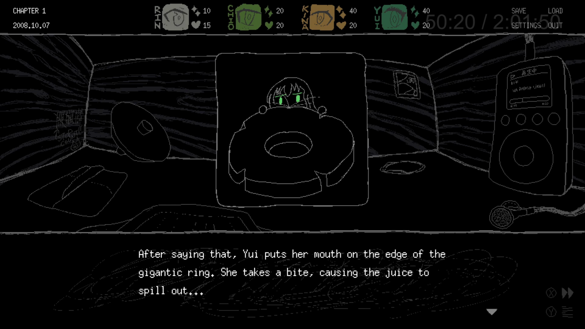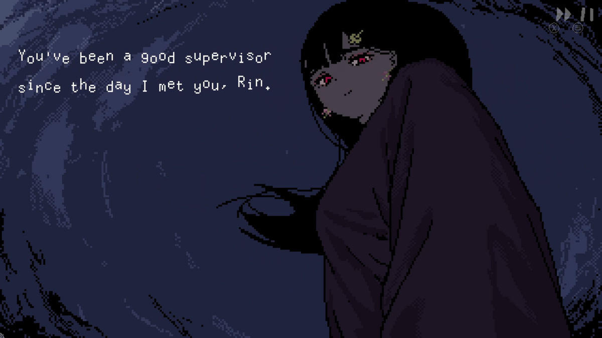 Aesthetically, the game looks fantastic. It has a clean interface, and the segments of chatting with Saeko are reminiscent of those Lofi girl streams. The contrast between the calm music and Rin’s palpable fear works great. The pixel art and animations are delightful as well. Though it’s frustrating to replay conversations with Saeko, I still enjoyed watching her facial expressions and hair animations. For all her cruelty and callousness—or, perhaps, because of her sociopathy—Saeko is a charming antagonist in the same vein as Tomie, and her face card never declines.