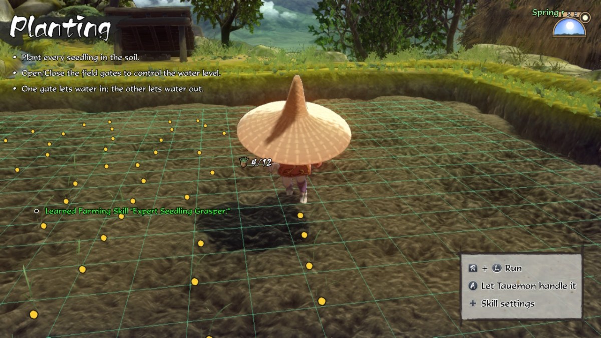 Which makes sense, when you think about it. At the same time, it was a bit frustrating, because I worried about the eventual harvests and if I was doing enough. Sakuna does learn additional skills by doing, One of the more helpful abilities appears very early into your second season on the island, as she’ll learn Planting Instincts. This adds a green grid to the field. But even with that and attempting to plant one seed in each box, I would still sometimes get the dreaded “too far apart” spacing warning. There were times when I wanted to ask Tauemon and Tama, “How do you expect Sakuna (or me) to succeed if you won’t even show us an example?” Oh, so the water should be ankle high? Well, since it is pretty difficult to reasonably see such details, it would sometimes be at Sakuna’s knee before I caught on.
