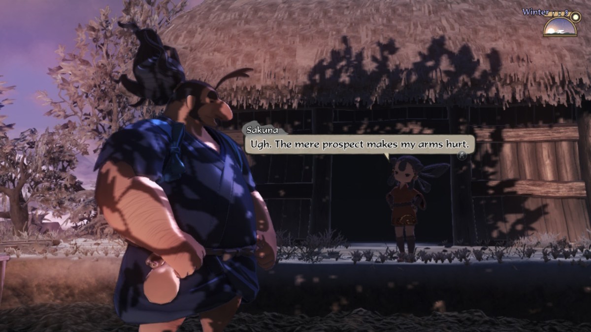 The thing about Sakuna: Of Rice and Ruin is that the player is oblivious going in as Sakuna herself is. Story of Seasons didn’t prepare you for this sort of farming simulation. Sakuna (or one of the villagers you might assign to the task) will have to till the soil, prepare the fertilizer, plant the seeds, weed the patch, adjust the water levels, harvest the rice, place it on the drying racks, thresh the plants, and hull the rice. Eventually, you get inventions to aid in the process and duties can be delegated, but I found the highest quality crops came from a more hands-on approach. And you’re going in blind, with only hints from Tauemon about how you’re doing.