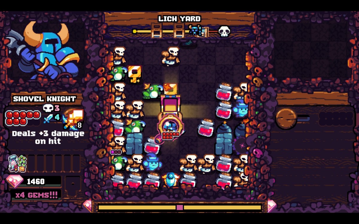 Like other puzzle games with falling “blocks,” success comes from eliminating them in Shovel Knight Pocket Dungeon. However, different ones are handled in different ways. Enemies start out as stationary foes. They deal damage to your knight when you hit them. Hitting one deals damage to it and all identical ones adjacent to it. The same goes for items like blocks or potions. This can allow you to clear larger areas more swiftly (and rack up more gems.) However, as you proceed, you’ll come across enemies with gimmicks. They might become temporarily invincible, deal more damage, or move. Your goal is to survive long enough for the door to appear. You then grab a key, head out, and move on. Fortunately, you can get stronger. Sometimes finding a key to a chest will give you a piece of equipment. You might find an entrance to a shop, where you can buy a relic to use for that run. Perhaps you’ll turn up in a room where clearing it of foes gets you a big reward. Maybe you’ll happen upon a shrine that needs three keys to open. This means you would have the luxury of letting more enemies chain up. That means more points and higher scores. It helps you be a bit riskier, which increases your potential rewards.