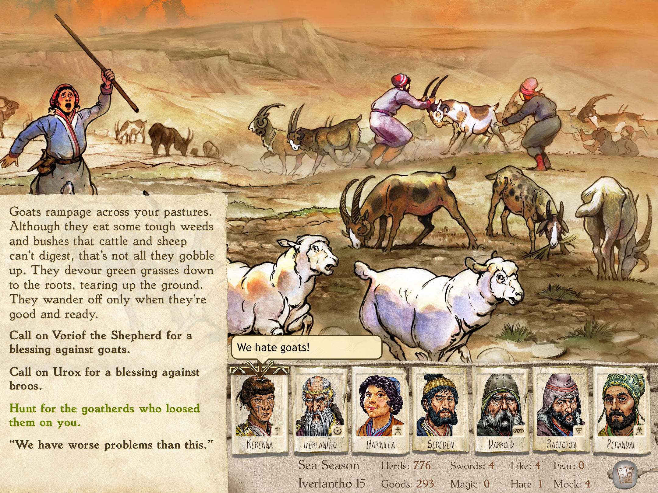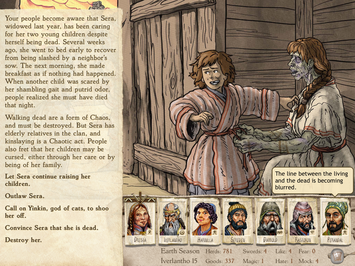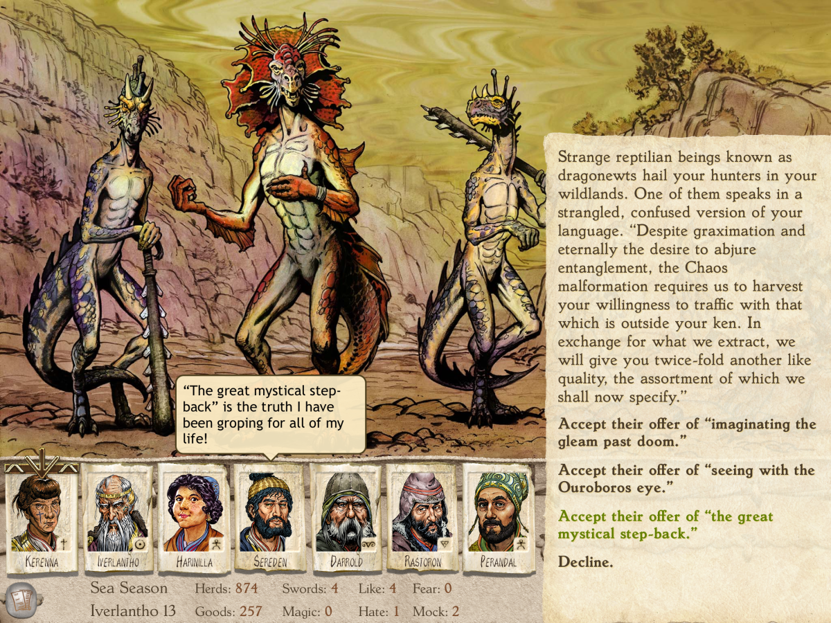 Especially since the scenarios you can face are so varied. Sometimes, they are dire. You can end up in what might feel like a no-win situation, depending on the people you’re interacting with and the side you might need to take. Some are incredibly funny, perhaps because of the advisors’ commentary. Learning the plural of the monster “walktapus” is “walktapi” from an Iverlantho comment delighted me. Also, I found Kerenna’s assertion that “we hate goats” really funny even though a number of chaos-afflicted animals were ruining our pastures and harassing our sheep. Especially since, as with