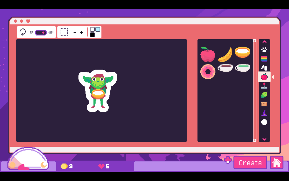 Sticky Business is bad. I feel it’s more like an outlet than anything. The number of available designs is rather limited. (For example, there are no humans to use in your sticker designs at all, with a lil’ goblin being the only real humanoid figure.) I’d have loved if I could have changed the primary color in all stickers, rather than only some offering the ability to select a different one. But what is there is still pretty ample, and it affords a lit of creativity if you’re willing to play around with elements and styles. For example, because the color palette is a bit limited, you can work with that to adjust the way elements flow together. As such, I was able to give the goblin the frog part as a face, put a bowl in its hands, and make a lil’ soup gremlin. (It is a very popular design.) The green of the potion liquid, tentacle, and frog head are all so similar that I made an iguana lounging. It’s an incredibly delightful game to play when you feel inspired and like you need to take a minute to breathe, play around with the limited selection, and perhaps come up with something special.