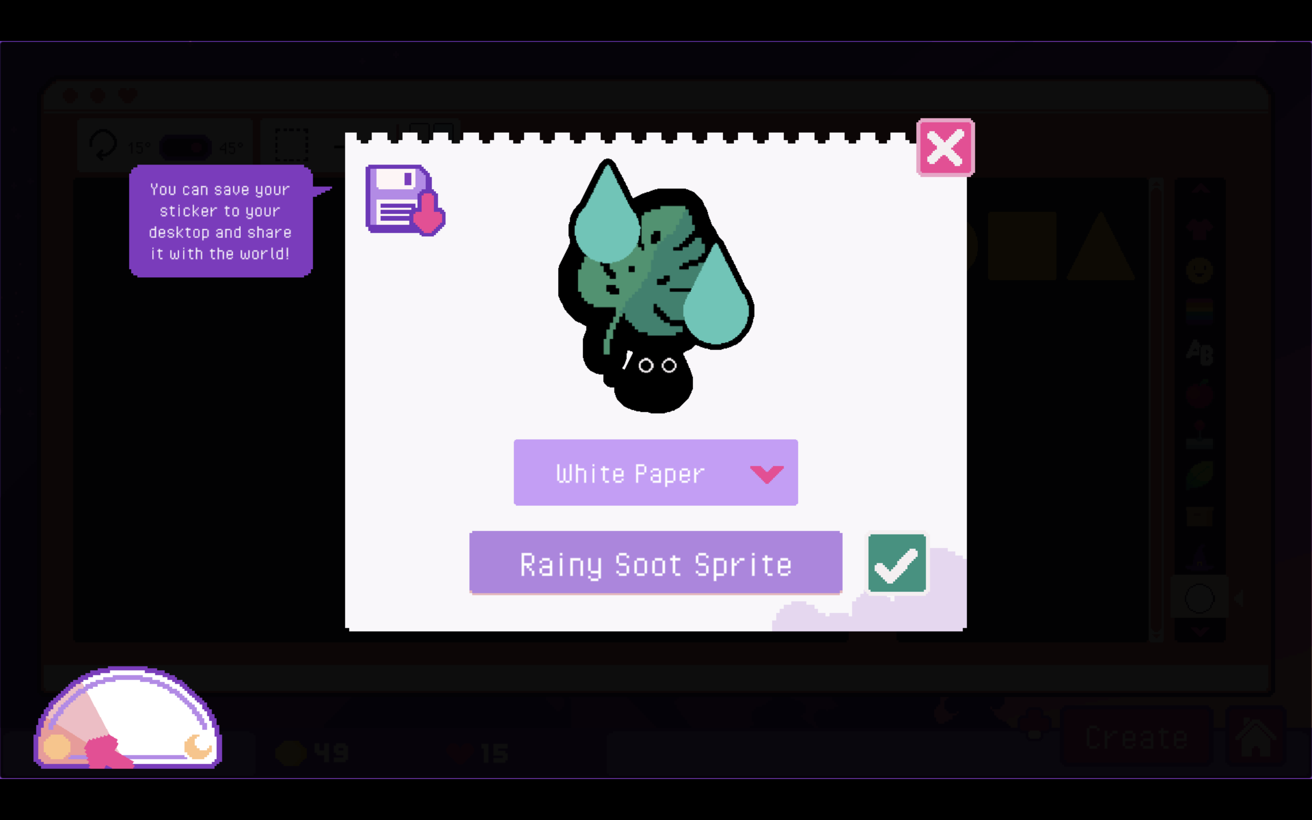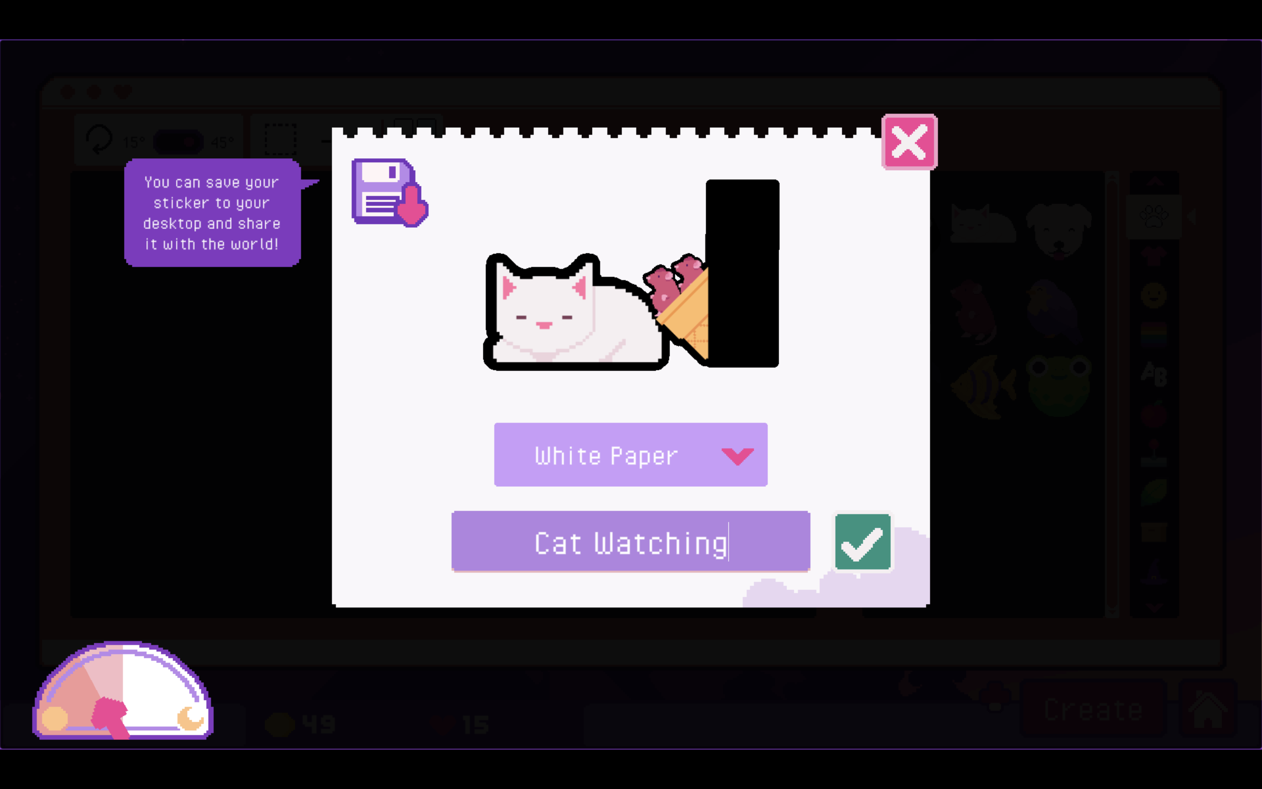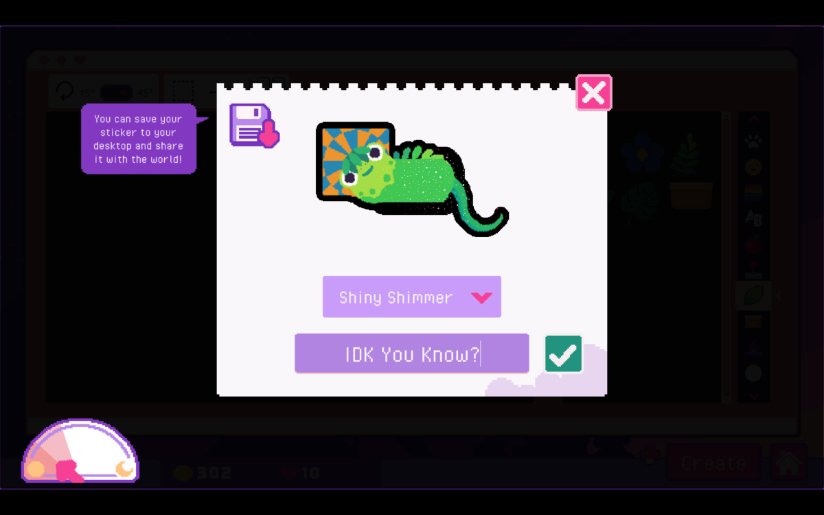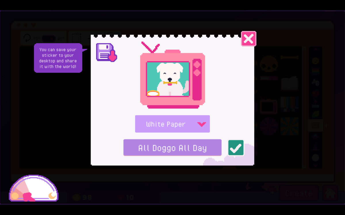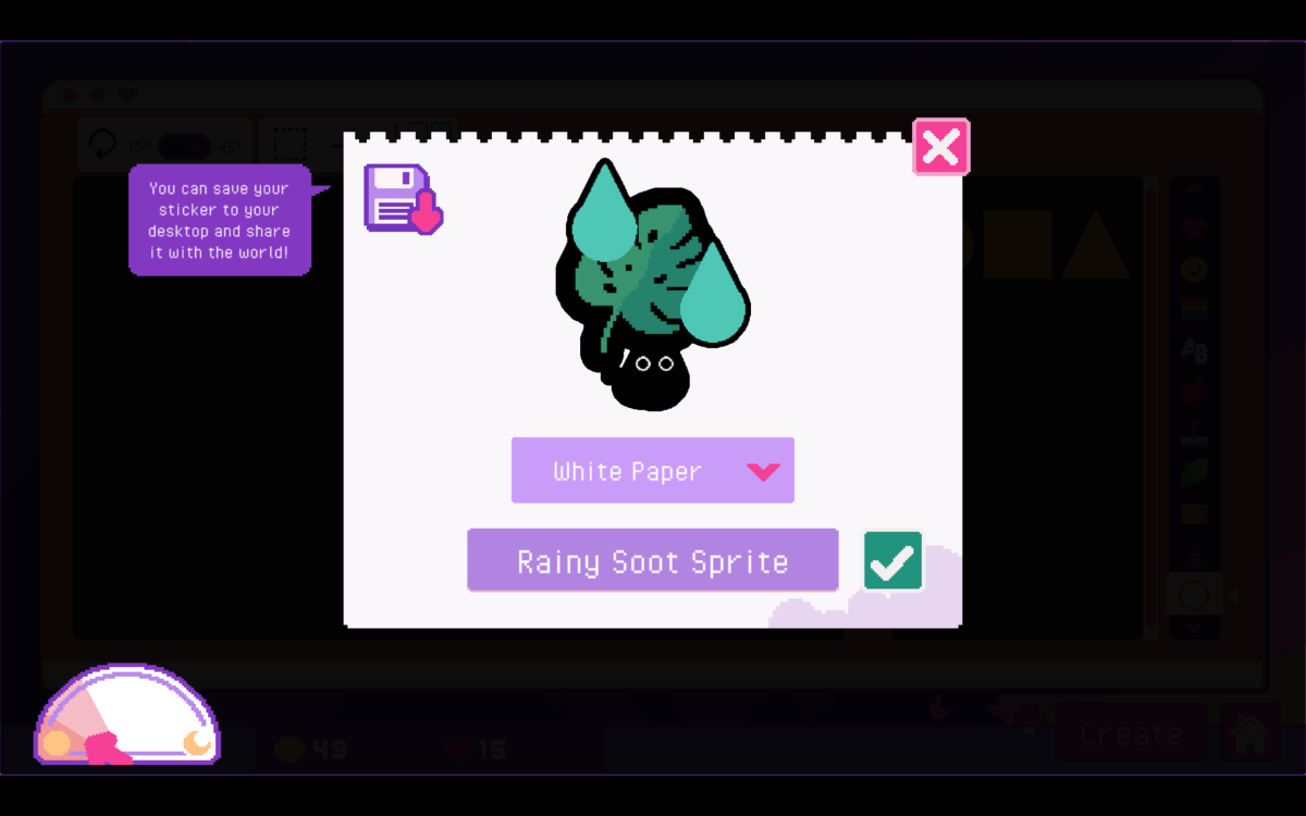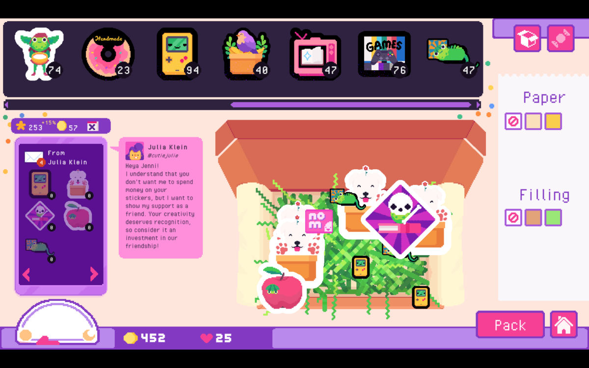 There isn’t any real “to-do” list. Once you come to the shop for the day, the first order of business is to basically pack any orders that came in. You can add extras like shredded paper grass, decorative tissue paper, or candy, with candy adding a percent increase to the money you earn from that order. You need to head to the mailbox after the whole lot is done. It might be worth printing more of certain stickers you are selling, if your stock is low. Maybe then you upgrade your offerings by increasing space for sticker designs, getting new sticker options, getting new colors, or picking up more sticker backings for the printer. If you run out of things to do or the day ends, you head to bed and wait for it all to start again. You never have any obligation. There are some optional requests, if you pay attention. Some customers will tell you about their lives and situations when you place orders, but you don’t have to listen. However, even though sometimes some would request I make stickers with a particular subject like rats, they would then… go on to not buy ones with those designs. (To be fair, one who requested a boba tea sticker and another with a “derpy face” did go on to buy that and advance their “storylines.”) But this is largely a situation where there’s no risk and all reward. In